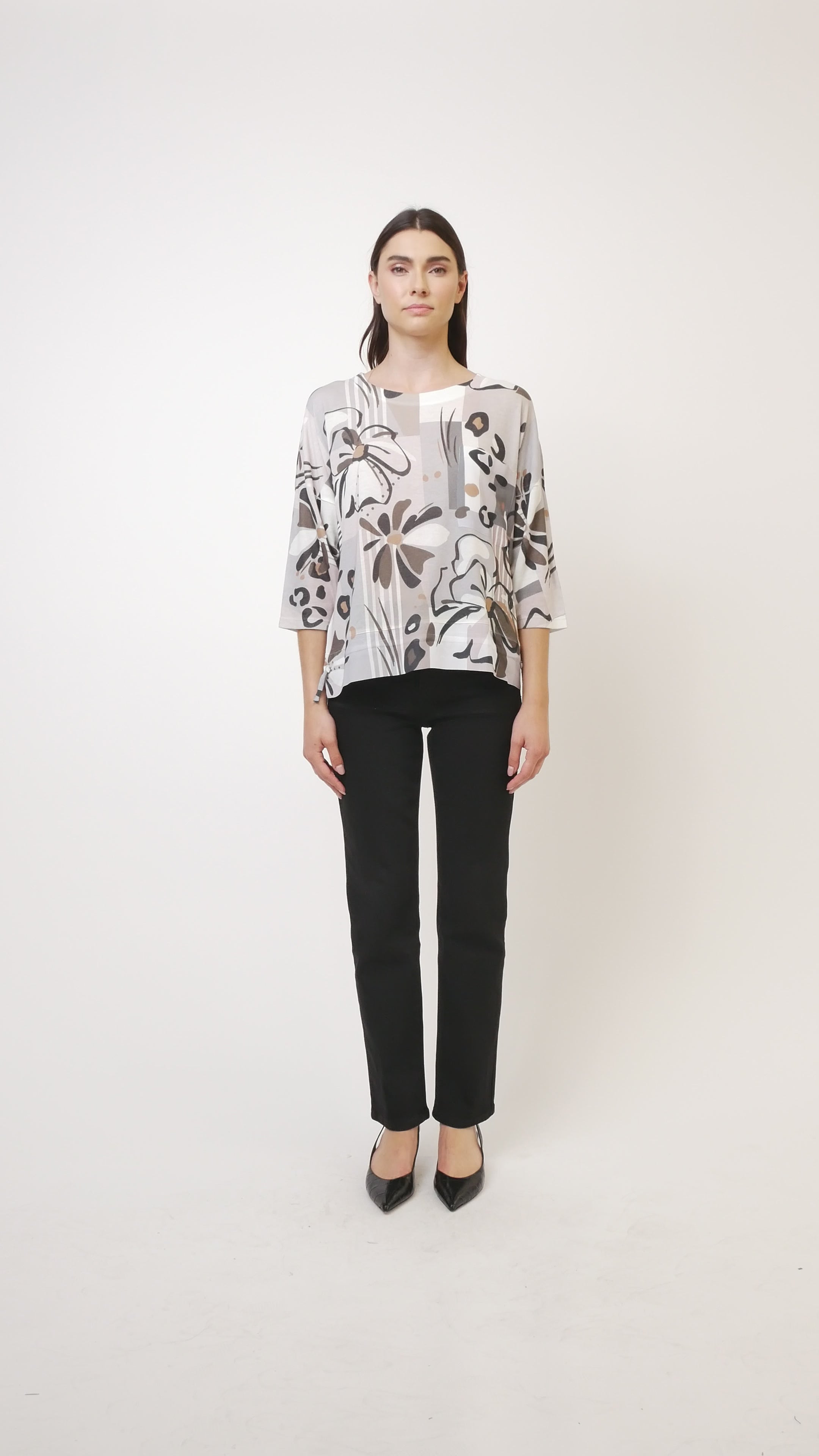 Brighten your wardrobe with this abstract floral print top, featuring breezy 3/4 sleeves and a flattering crew neckline. Crafted from soft knit fabric and detailed with delicate chiffon trim, it adds a touch of lightness and charm. The adjustable drawstring hemline lets you customize the fit for effortless style. Made in Italy, this top blends comfort and chic in one perfect package.