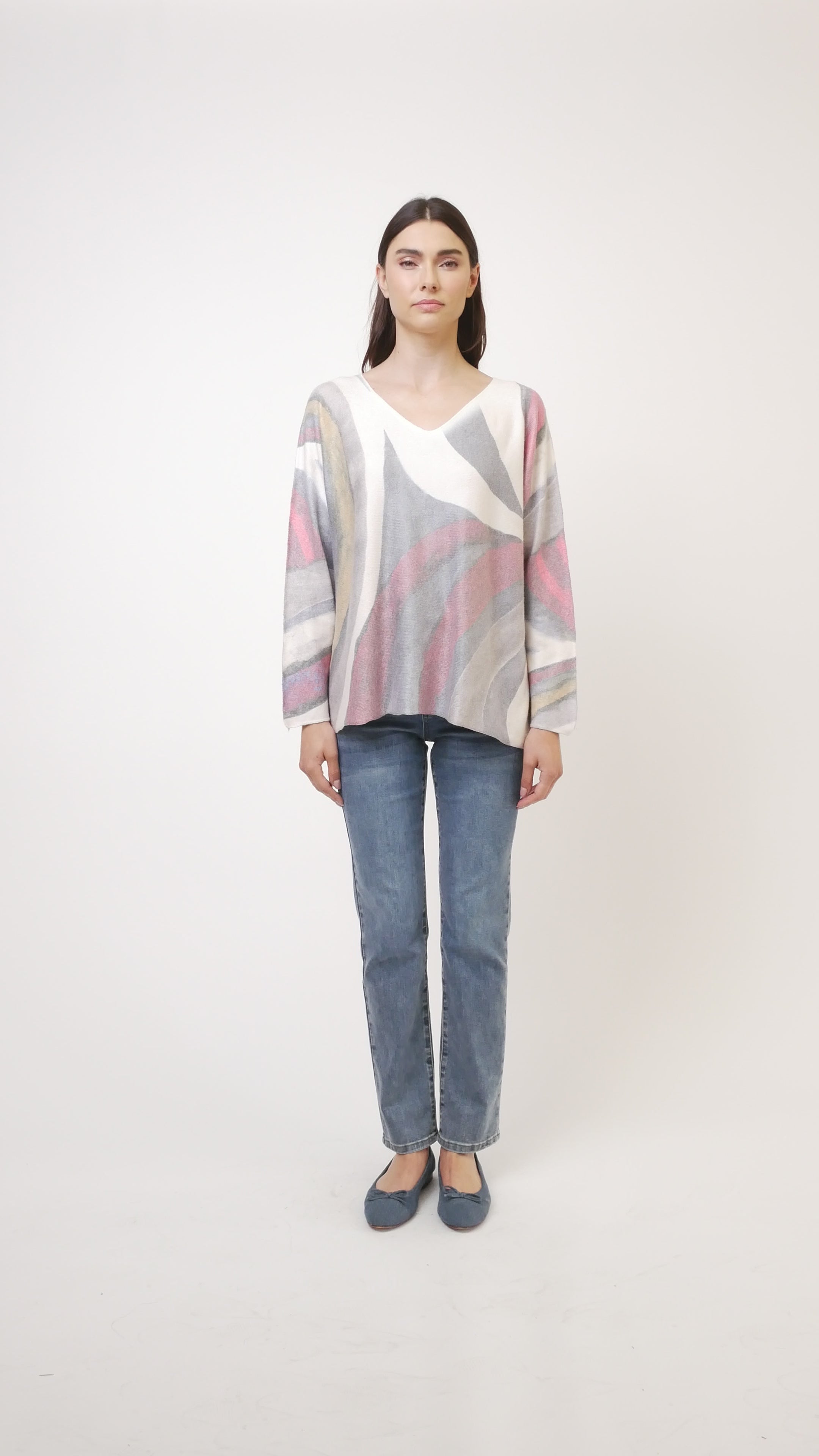 Cozy up in this abstract print sweater featuring a flattering V-neckline and long sleeves. Crafted from soft knit fabric made in Italy, it brings a touch of artful charm and comfort to your wardrobe. Perfect for layering or wearing solo, it’s your new go-to for effortless style with an edge.