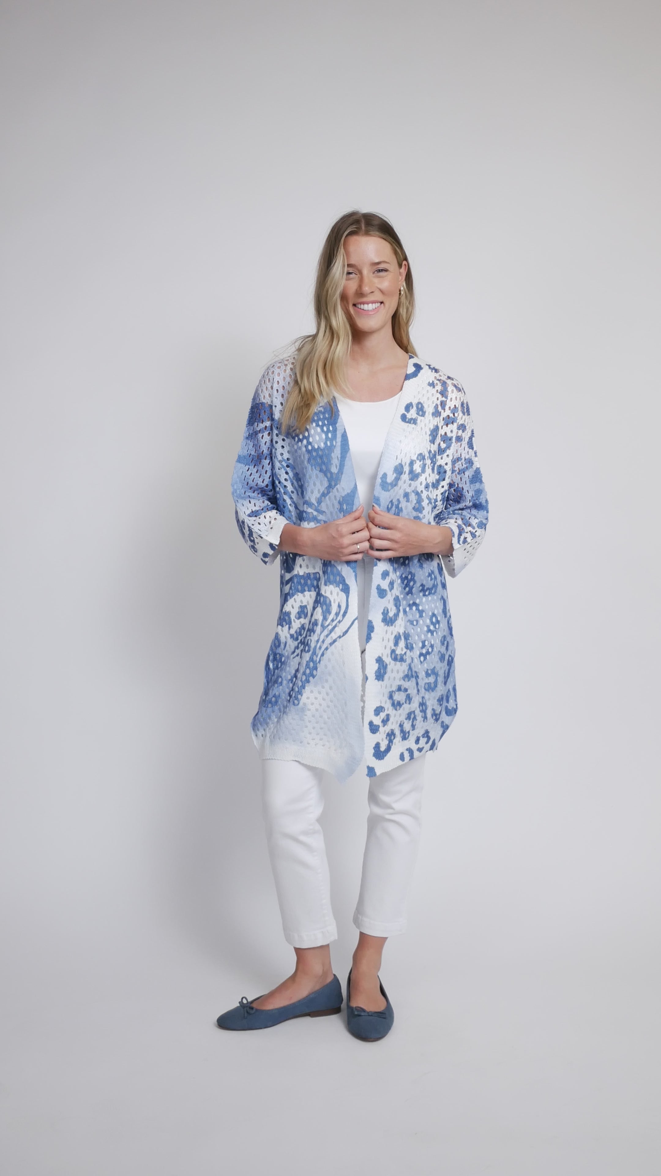 Throw on this charming animal print cardigan and let your style do the talking. Crafted by Via Vitale in Italy, this open-front beauty features delicate crochet fabric that's perfect for layering. The three-quarter sleeves hit just right for effortless sophistication. Whether you're dressing up a simple tee or throwing it over a sundress, this piece brings texture and personality to any outfit.