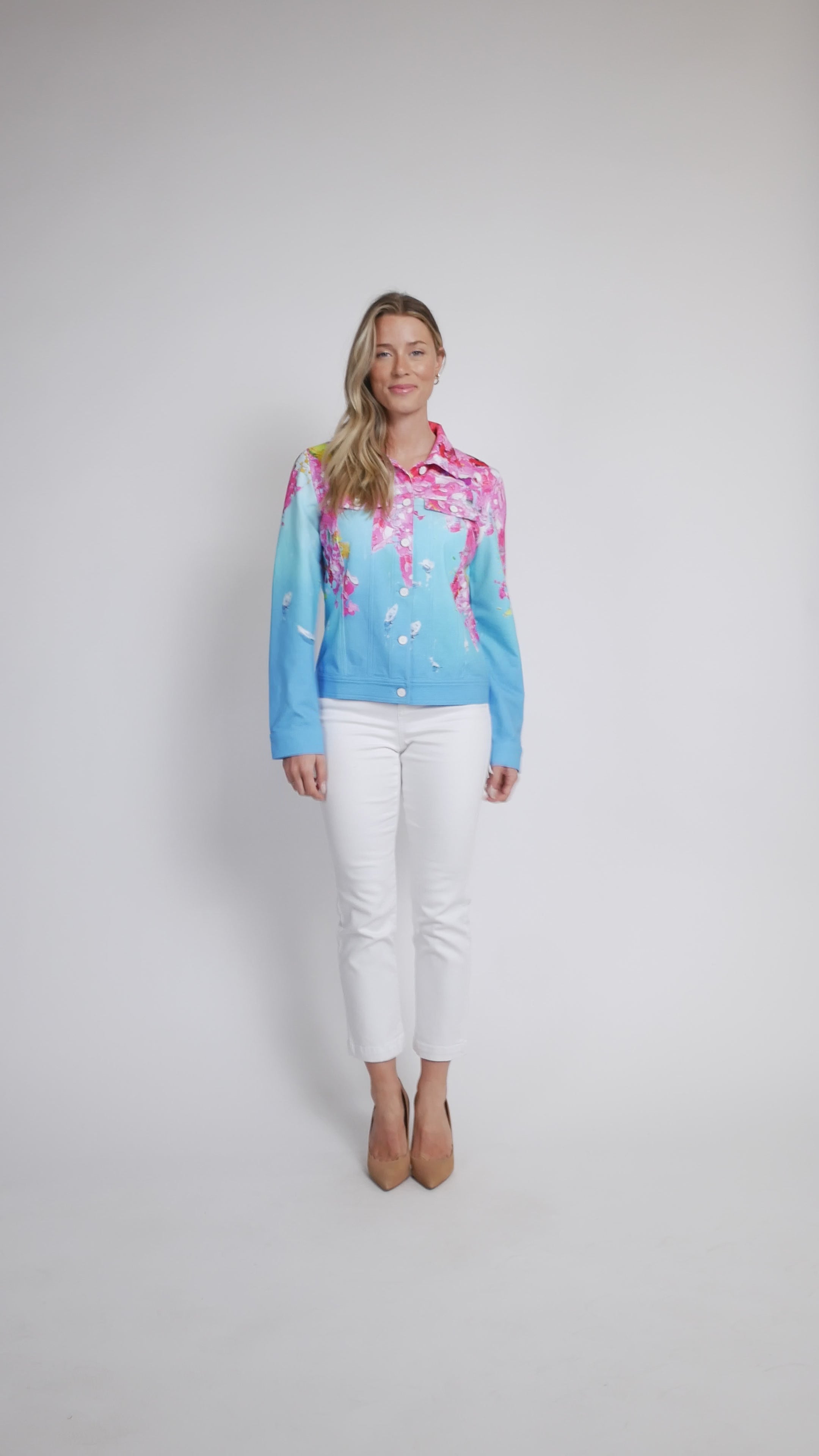 Introducing the Capri print knit jacket—where comfort meets artistic flair! This piece features a charming shirt collar and button-front closure for easy layering. The soft knit fabric drapes beautifully, while the front pocket with flap detail adds practical style. Long sleeves keep you cozy, and the vibrant Capri print brings a splash of Mediterranean-inspired color to your wardrobe. Designed by artist Aziz Sulaymanov, this Dolcezza creation is perfect for those who love wearing wearable art that feels as good as it looks.