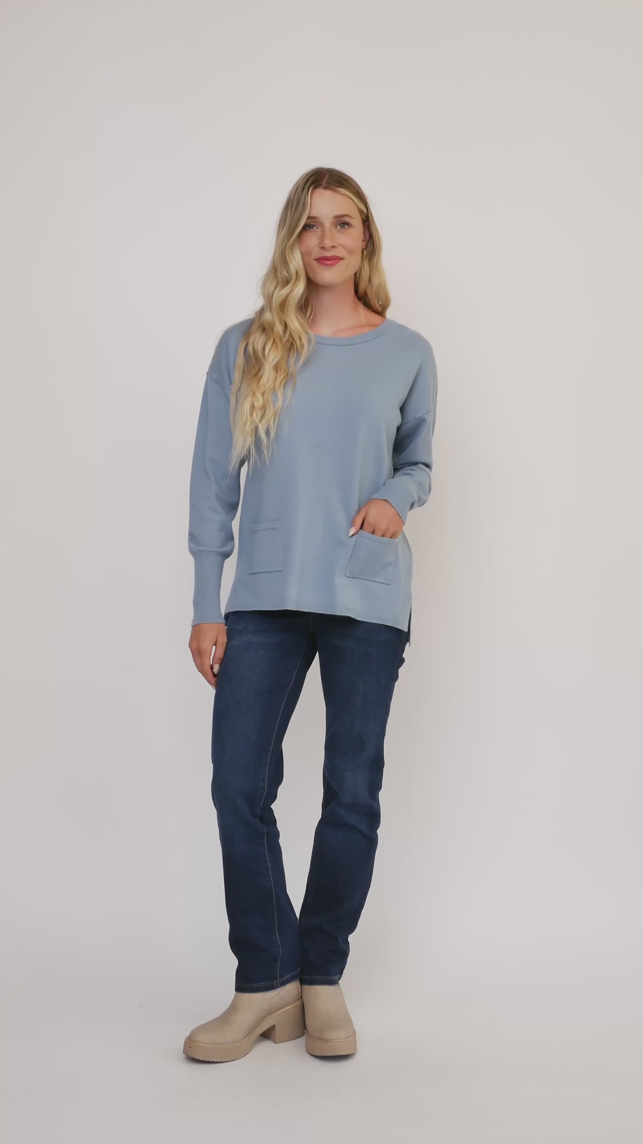 This sweater features long sleeves and a cozy round neckline, perfect for layering on chilly days. Crafted from soft knit fabric, it offers comfort and warmth. Delight in the charming front pockets and colorful buttons that add a fun pop of personality to your outfit. A cheerful addition to any wardrobe by Orly!
