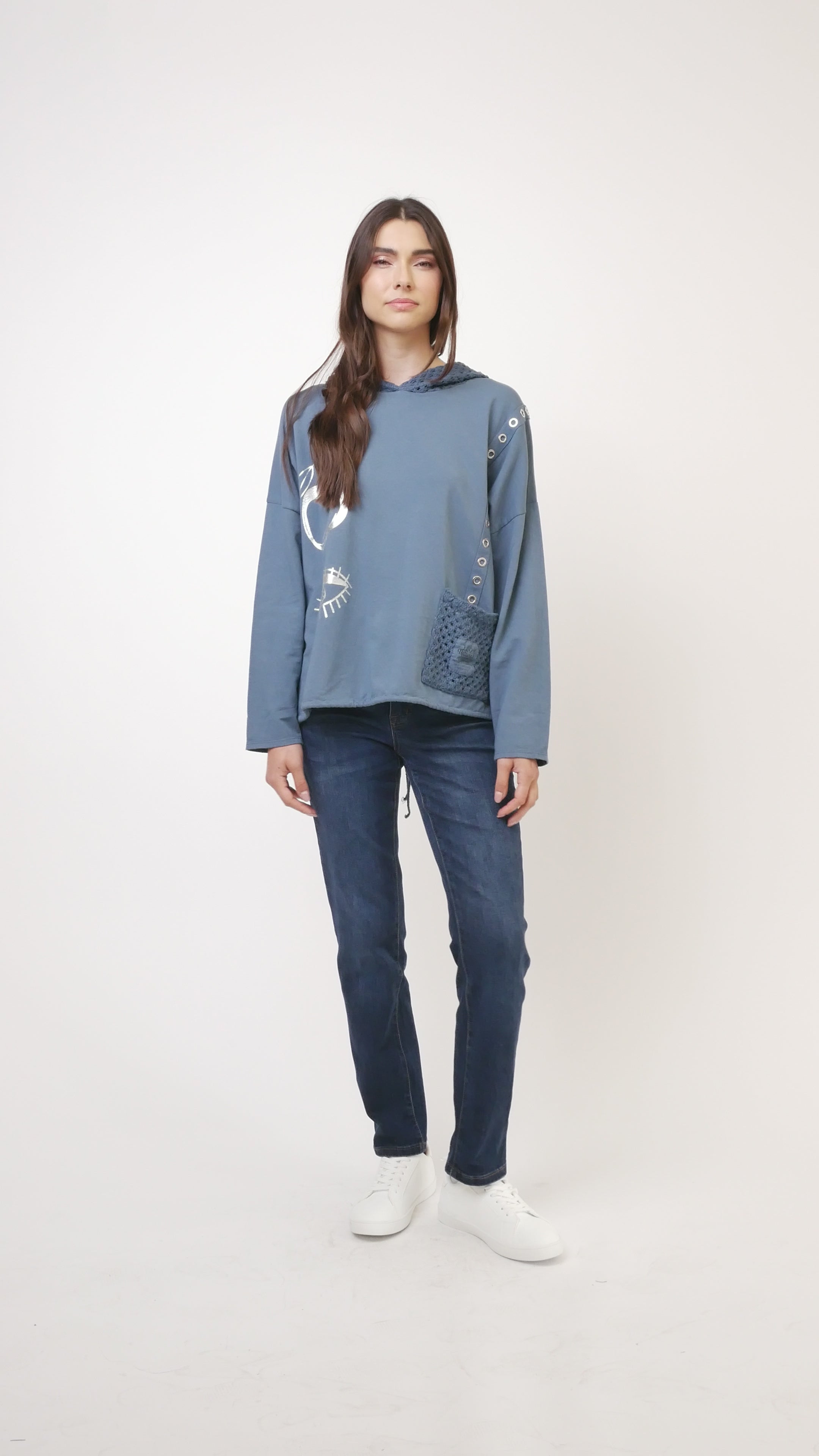 This hoodie combines the charm of a delicate crochet hood with eyelet detailing for a fresh, fun look. Made from soft cotton fabric in Italy, it features long sleeves, a cozy pocket, and a cord at the hemline for an adjustable, comfortable fit. Perfect for adding a unique, stylish twist to your casual wardrobe.