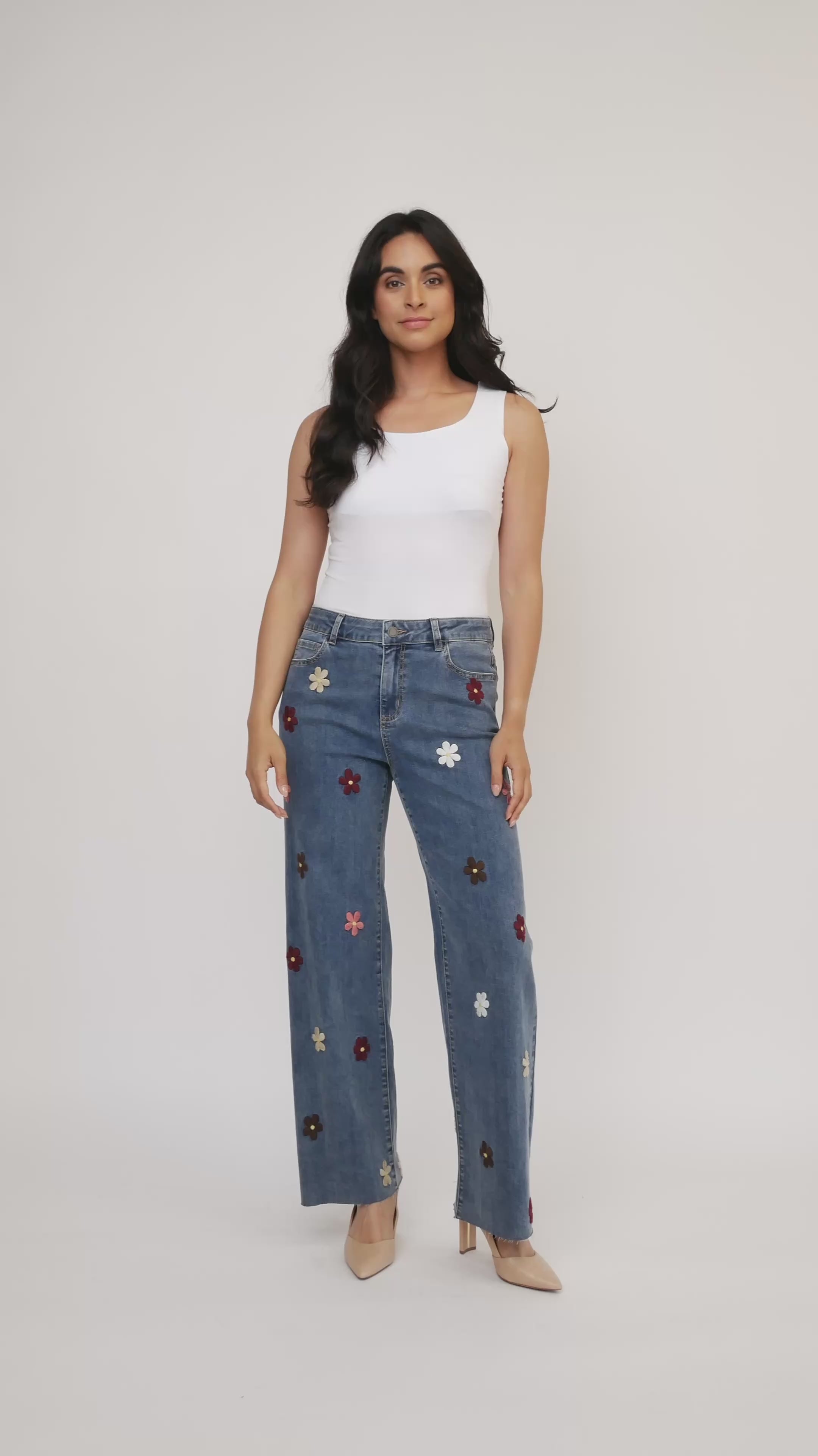 Step out in style with these wide-leg jeans by Charlie B. Featuring charming flower embroidery, a classic five-pocket design, and a secure zip and button closure, they blend comfort and flair effortlessly. The cotton blend fabric ensures a soft feel, while belt loops let you add your favorite accessory. Perfect for adding a fun, fresh touch to any outfit!
