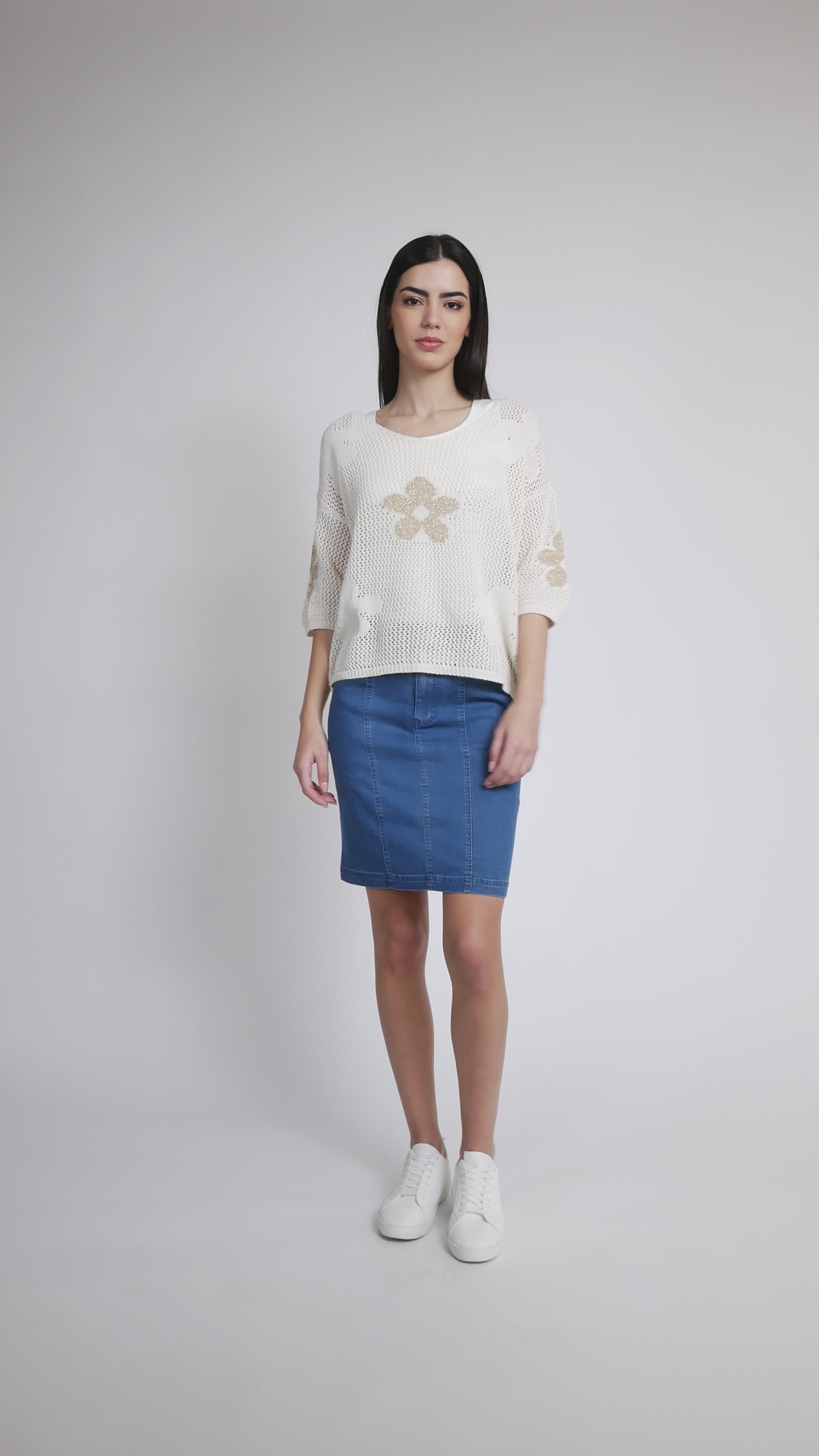 Elevate your everyday style with this charming Via Vitale sweater, crafted in Italy from a cotton blend. The flattering V-neckline and three-quarter sleeves create the perfect balance of comfort and sophistication, while delicate gold flower details add a touch of whimsy. Whether you're dressing up for brunch or keeping it casual, this versatile piece brings effortless elegance to any wardrobe.