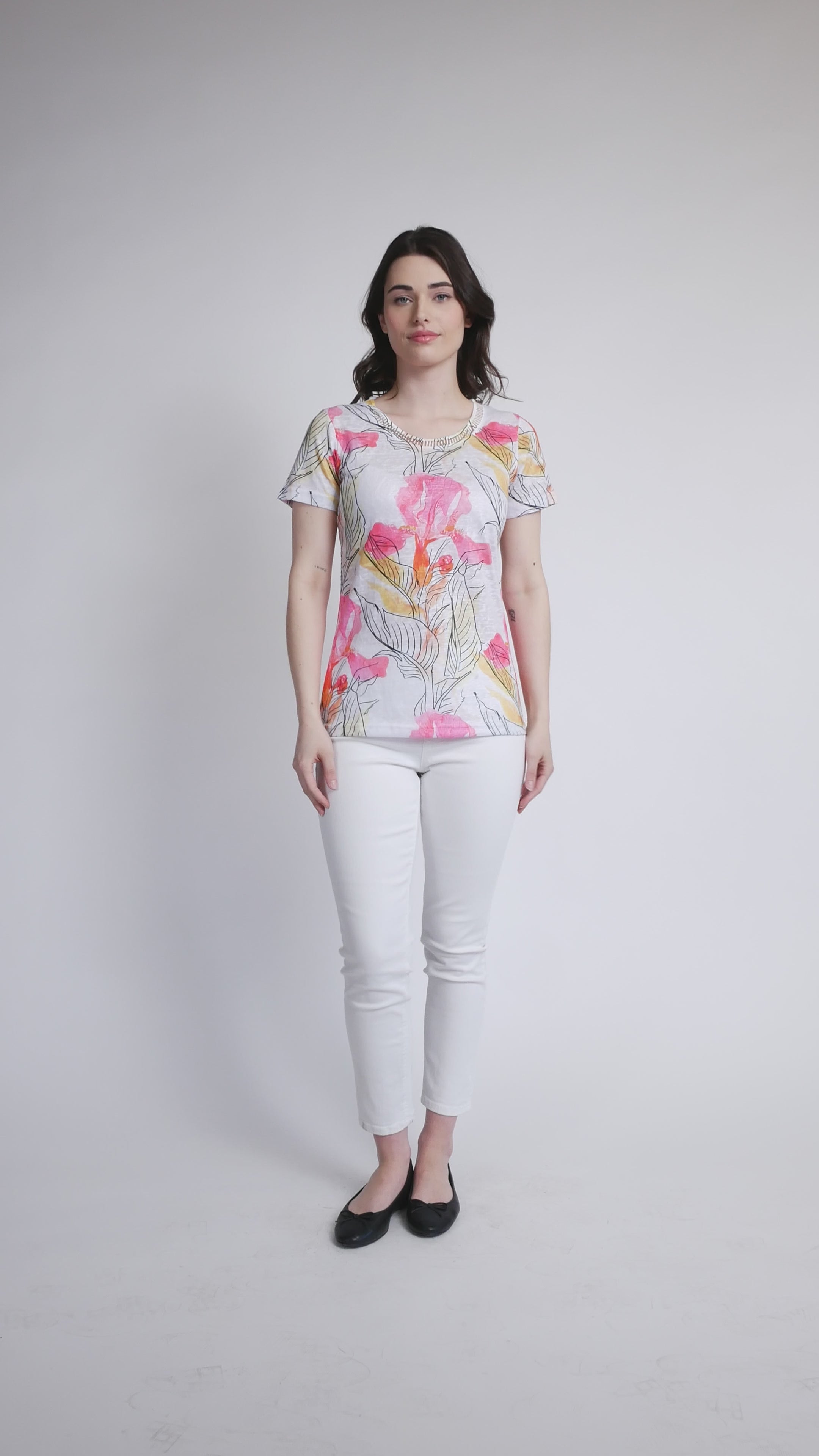 Effortlessly chic and ready for anything, this printed top brings botanical beauty to your everyday rotation. The lightweight knit fabric drapes beautifully while keeping you cool and comfortable, perfect for layering or wearing solo. With its classic crew neckline and short sleeves, it's the kind of piece that works as hard as you do—whether you're heading to brunch or running errands around town. A print that adds personality without trying too hard.
