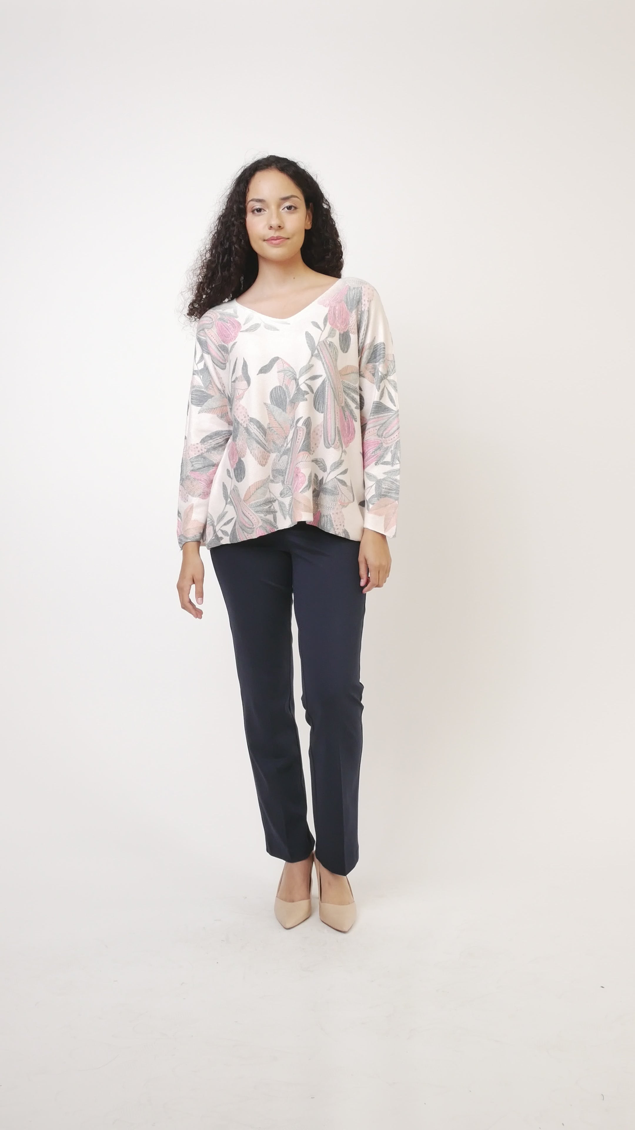 Cozy up in this leaf print sweater featuring a flattering V-neckline and long sleeves for all-day comfort. Crafted from soft knit fabric made in Italy, it brings a touch of European charm to your wardrobe while keeping you stylishly warm. Perfect for adding a fresh, nature-inspired vibe to any outfit!
