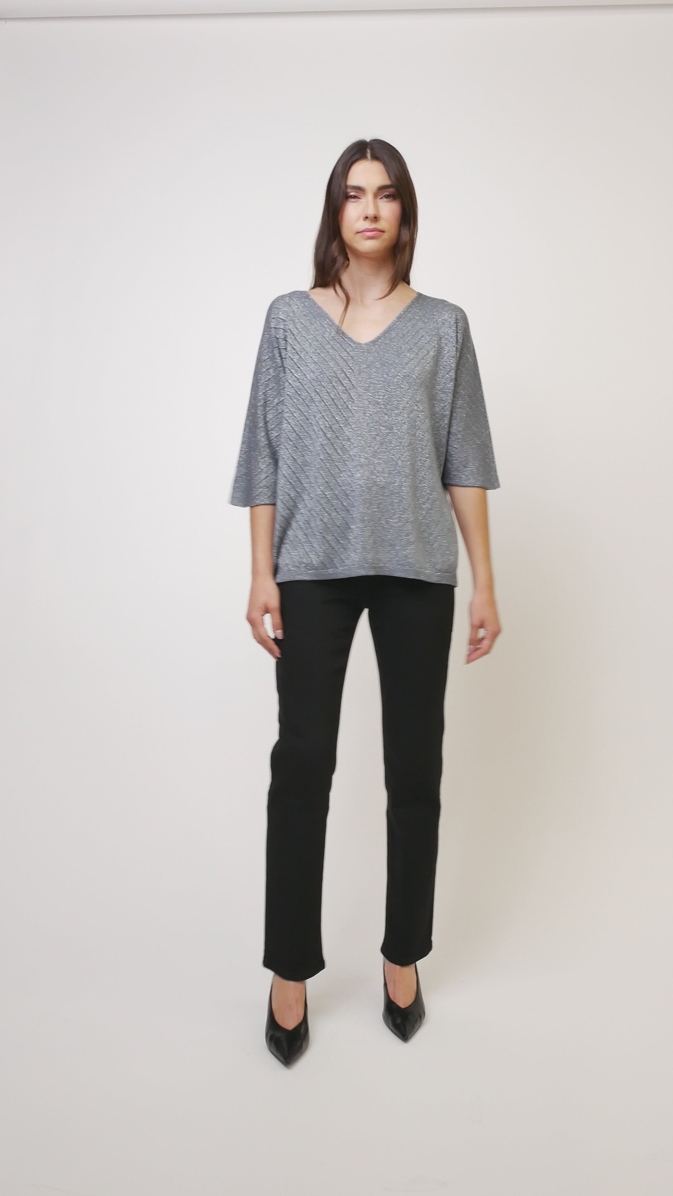 Brighten your style with the pointelle sweater, featuring 3/4 dolman sleeves and a chic V-neckline. Made from soft Italian knit fabric, its delicate pointelle and shimmering lurex details add a sparkle that effortlessly lifts any outfit.