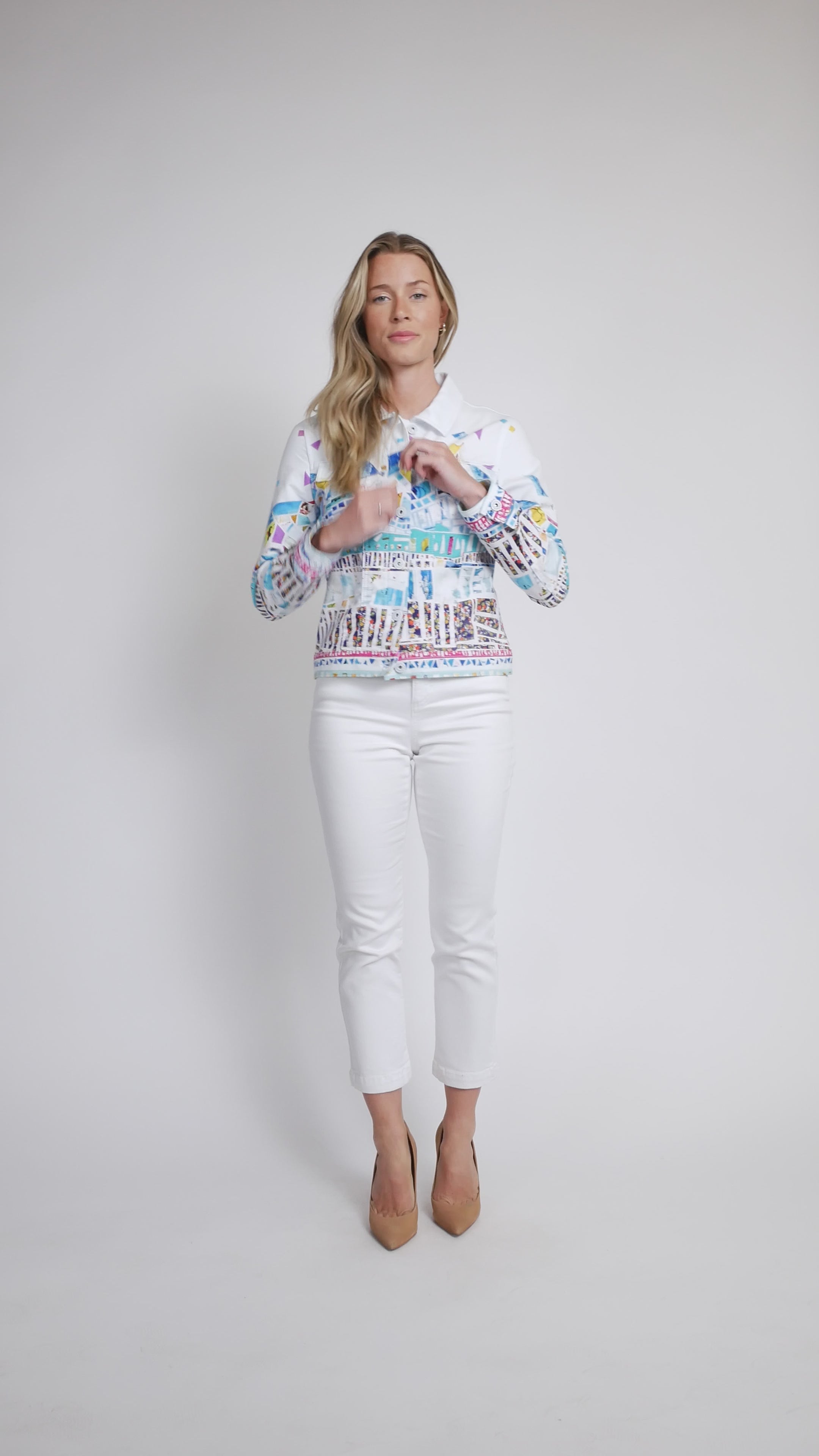 Elevate your everyday style with this charming mosaic border knit jacket from Dolcezza. Crafted by artist Stephanie H., this piece features a classic shirt collar, convenient button-front closure, and a practical front pocket adorned with a flap detail. The soft knit fabric drapes beautifully while keeping you cozy, making it perfect for layering over your favorite tees or dresses. A versatile wardrobe essential that brings artistic flair to any outfit. Available in Petite and Regular fit.