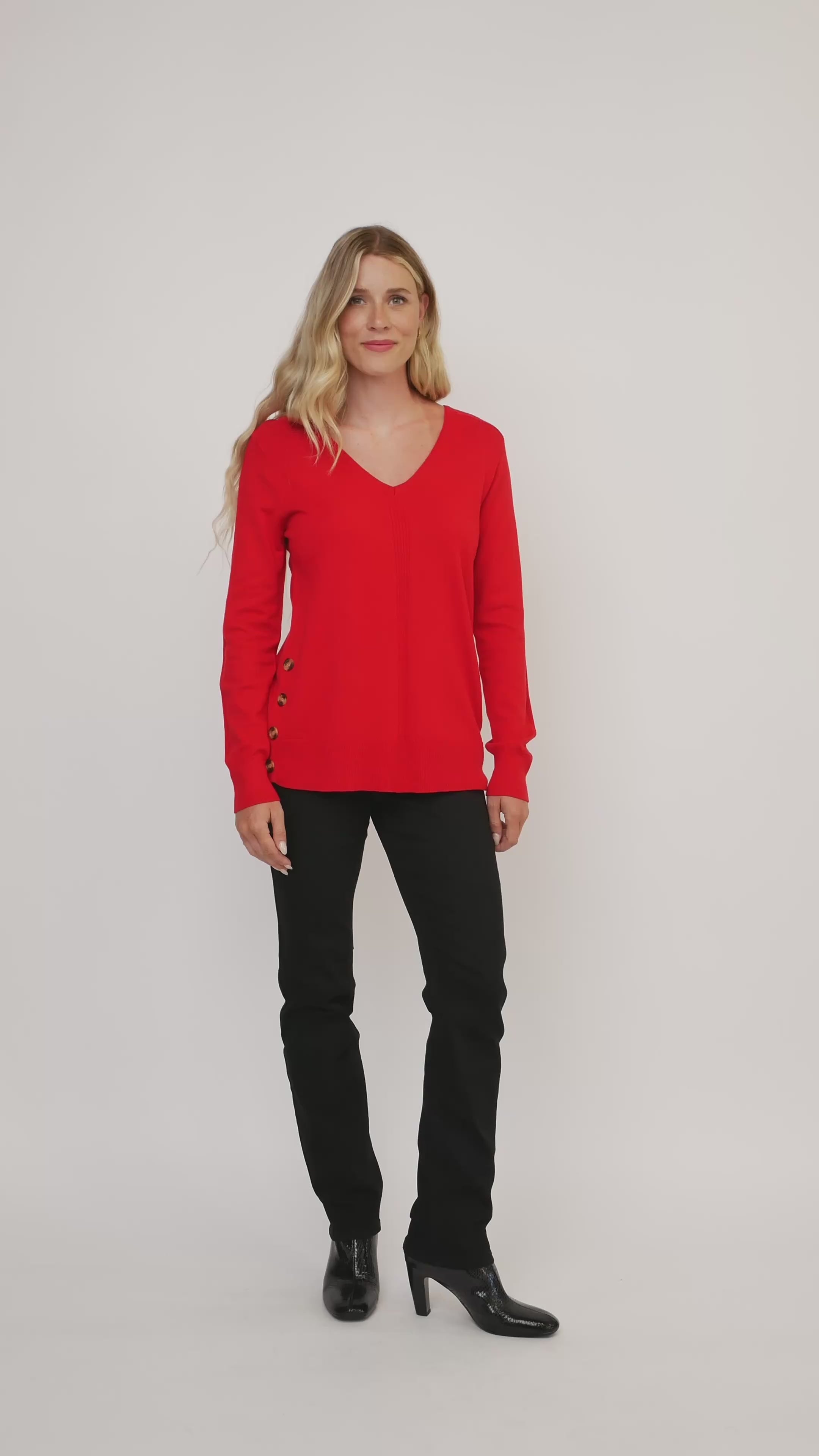 Cozy up in style with this playful side button detail sweater from Alison Sheri! The long sleeves keep you warm while the flattering V-neckline adds a touch of elegance. Adorable side buttons give this knit sweater personality and flair - perfect for mixing fun and fashion in your everyday wardrobe!
