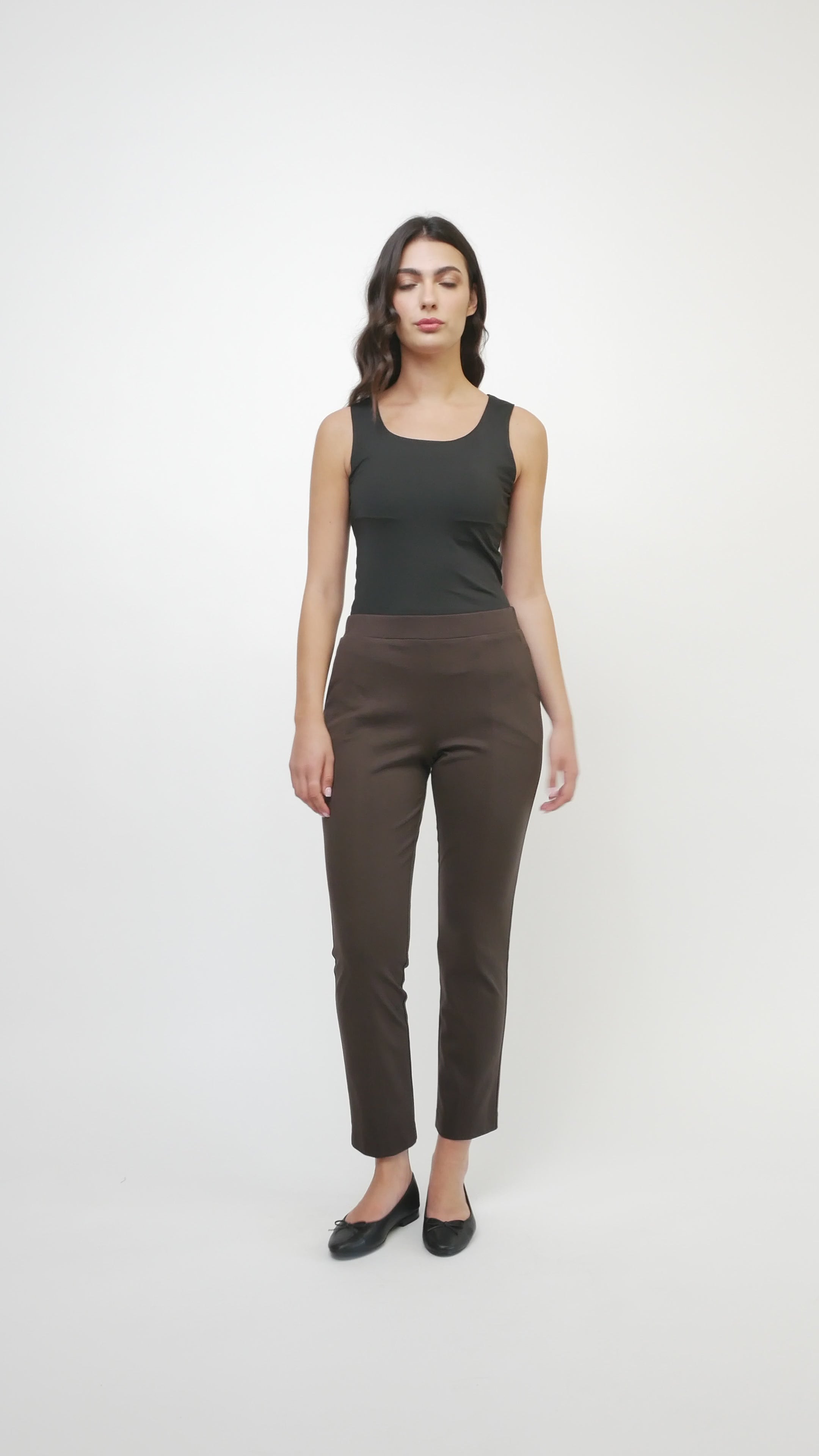 Step into comfort with a twist in these slim leg pants crafted from soft Ponti di Roma fabric. Featuring an easy pull-on style, inside waistband elastic for a perfect fit, and handy pockets for your essentials. Front seam and side slit details add a fun, flirty edge to your everyday look.
