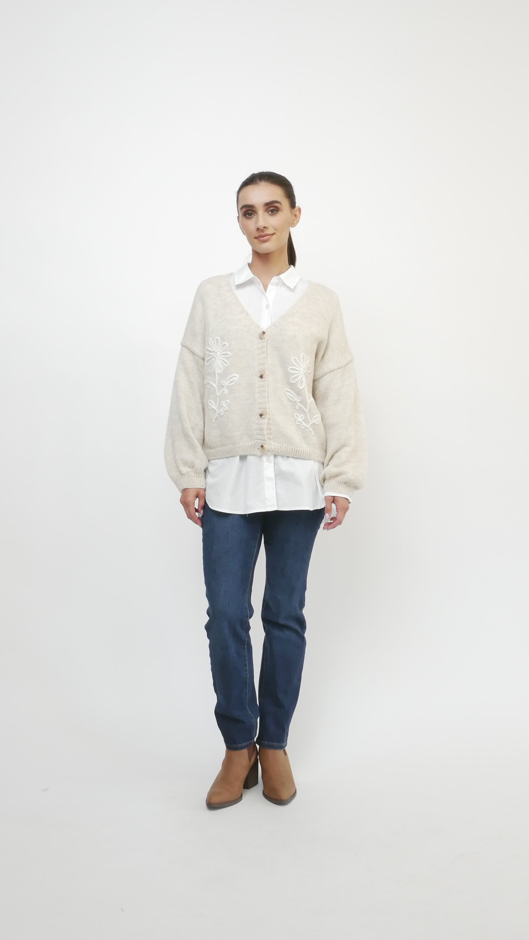 This cardigan features a flattering V-neckline and charming four-button detail that adds a touch of whimsy. Crafted from soft knit fabric with intricate soutache accents, it brings a unique texture and style to your wardrobe. Made in Italy by Via Vitale, this long-sleeve piece combines comfort and elegance for a fun, fashionable look.