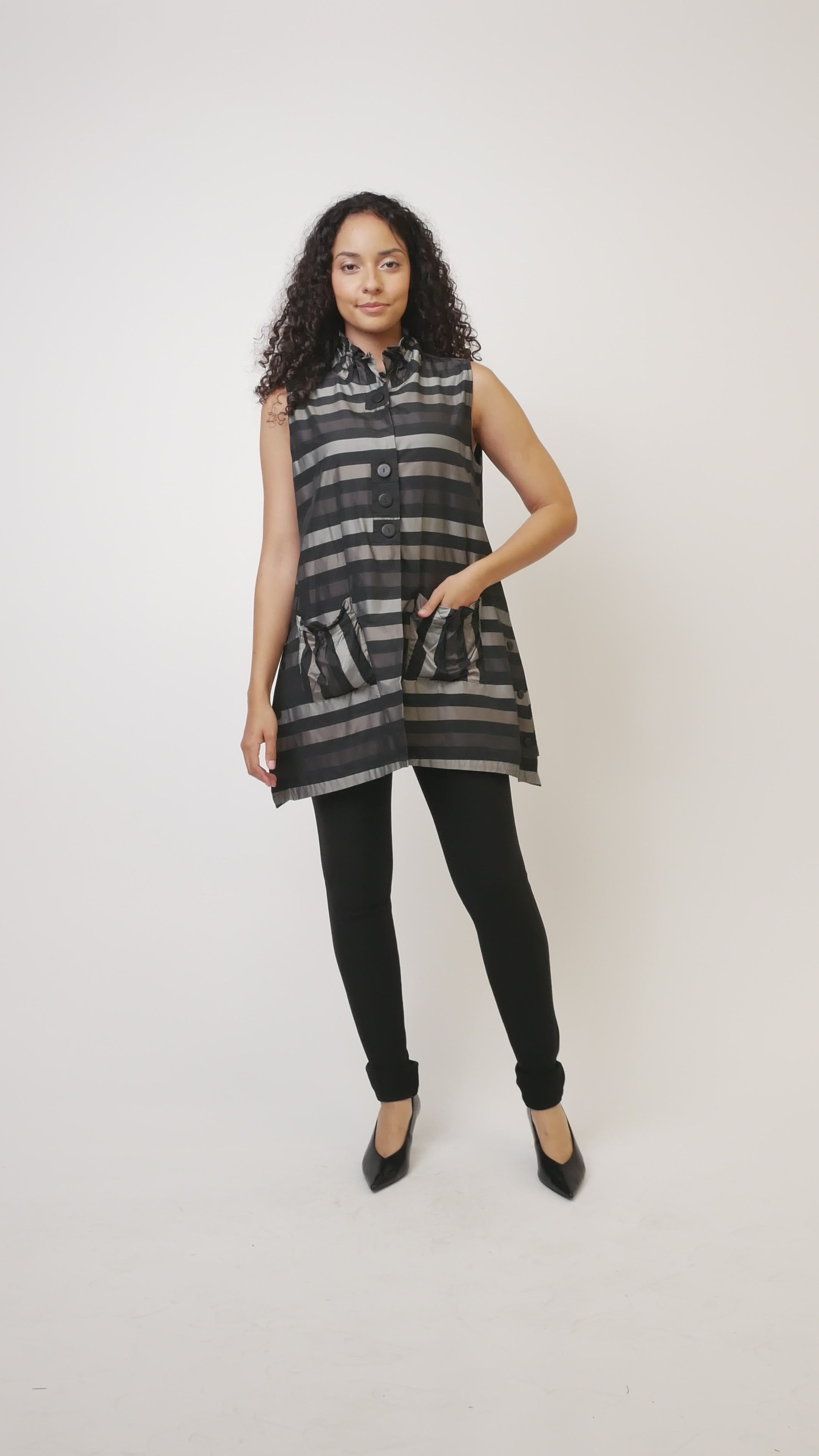This striped tunic features a breezy sleeveless design with a classic shirt collar and fun hi-low hem for extra flair. The front button closure and side slits with button details add stylish accents, while the shark bite hem gives it a unique twist. Patch pockets bring casual charm and practicality to your look. Perfect for layering or wearing on its own, this tunic combines comfort with a splash of personality.