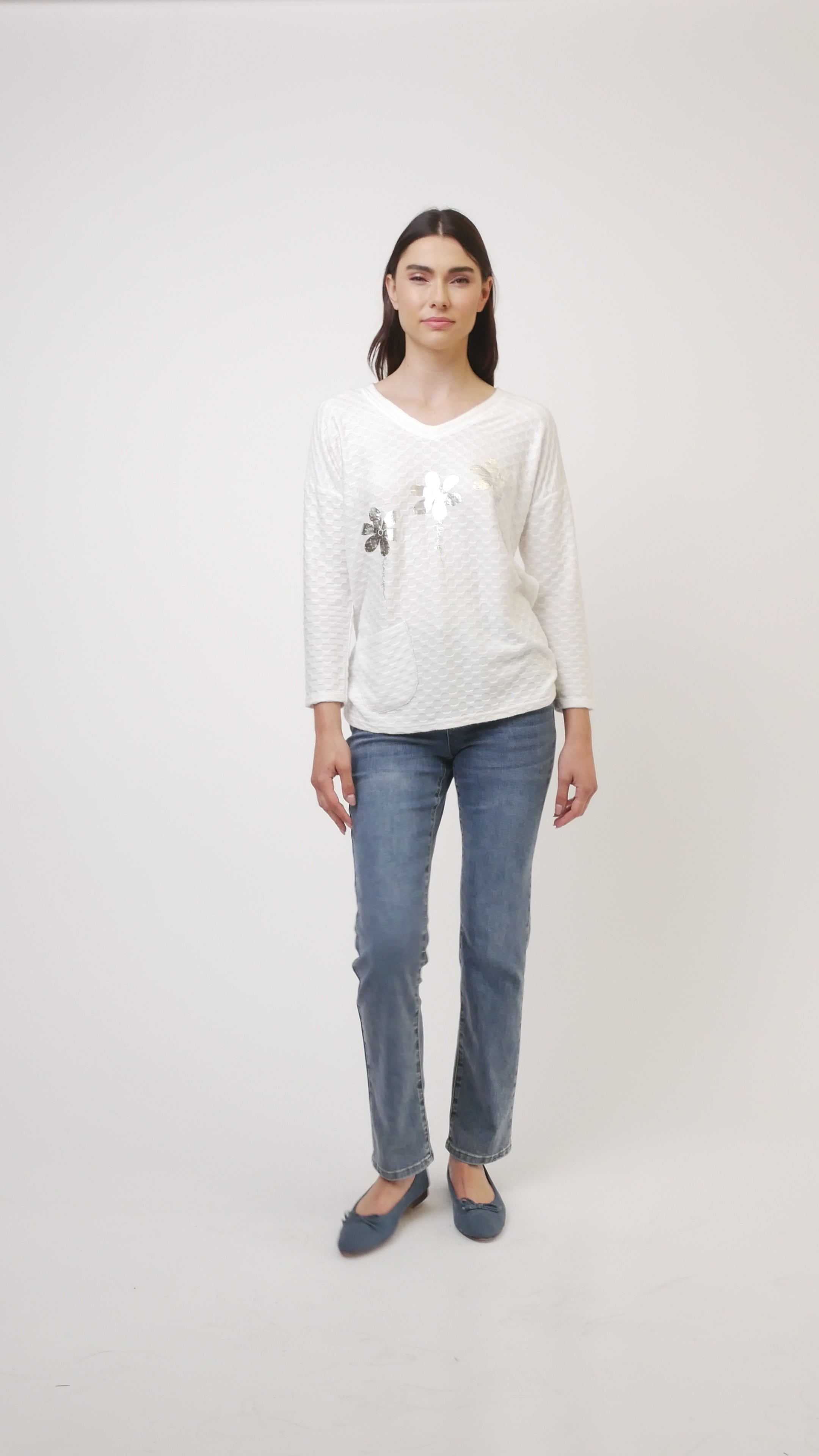 This textured bloom embossed top features a flattering V-neckline and breezy 3/4 sleeves perfect for any occasion. Crafted from luxe textured knit fabric made in Italy, it offers unique pocket details that add charm and practicality. Embrace effortless style with a touch of Italian elegance!