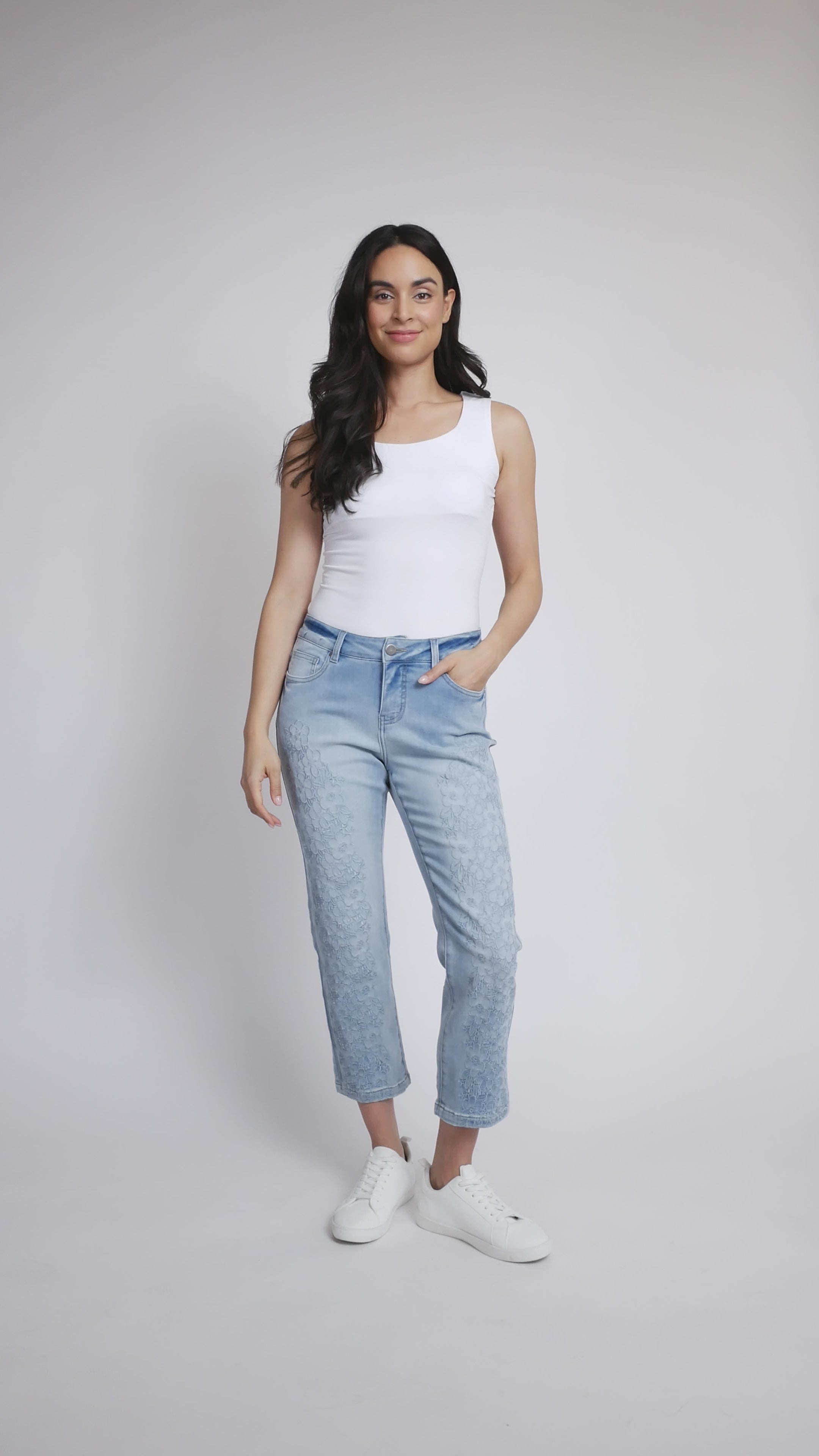 Meet your new go-to capri! This Picadilly denim delivers style with a twist. The slim leg cut flatters your figure while the cotton blend fabric keeps things comfy and breathable. A classic fly front button closure pairs perfectly with functional pockets for all your essentials. The star of the show? Gorgeous tonal embroidery detailing that adds just enough personality without stealing the spotlight. Casual, chic, and ready for anything.