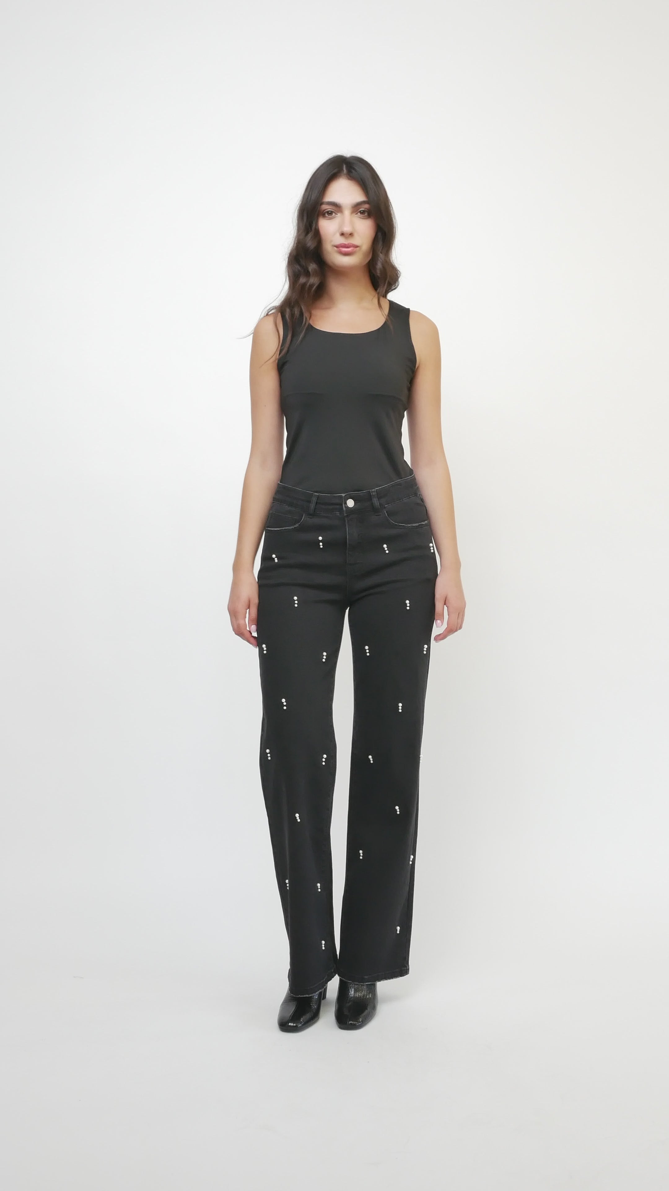 Step out in style with these wide-leg jeans featuring sparkling rhinestone details that add just the right amount of glam. Crafted from classic denim, they offer a comfortable fit with a zip and button closure, five-pocket design, and belt loops to complete your look. Perfect for turning heads while keeping it casual and fun!