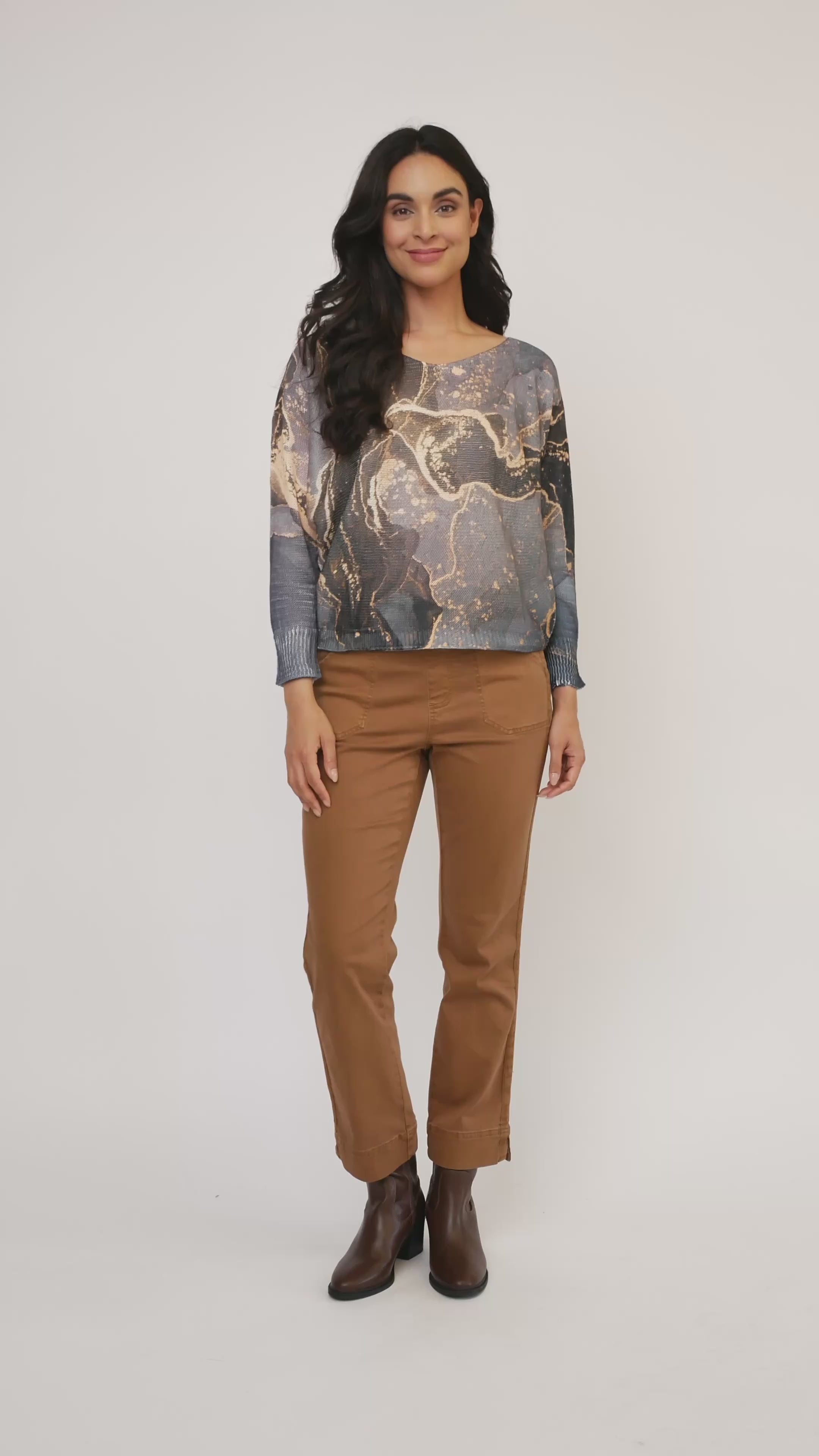 Ce pull présente de longues manches et un décolleté en V flatteur. Il est confectionné en maille douce fabriquée en Italie par Via Vitale. Son détail métallisé accrocheur ajoute une touche d'éclat à l'imprimé abstrait, idéal pour ajouter une touche de fantaisie et d'élégance à votre garde-robe quotidienne.