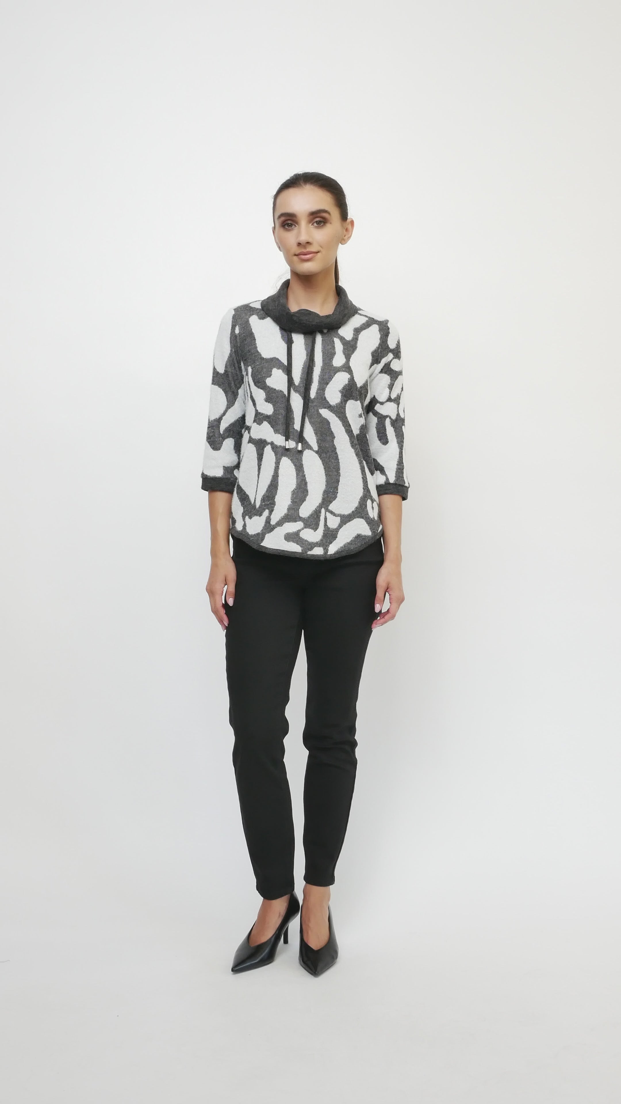 Cette tunique à imprimé animalier est dotée de manches 3/4 et d'un col bénitier douillet rehaussé d'un charmant cordon. Le détail contrasté lui confère une touche élégante, tandis que le tissu à imprimé animal lui confère un toucher doux et texturé, signature exclusive de Cazza Petite et Zacks. Idéale pour ajouter une touche d'originalité à votre garde-robe, avec confort et style.