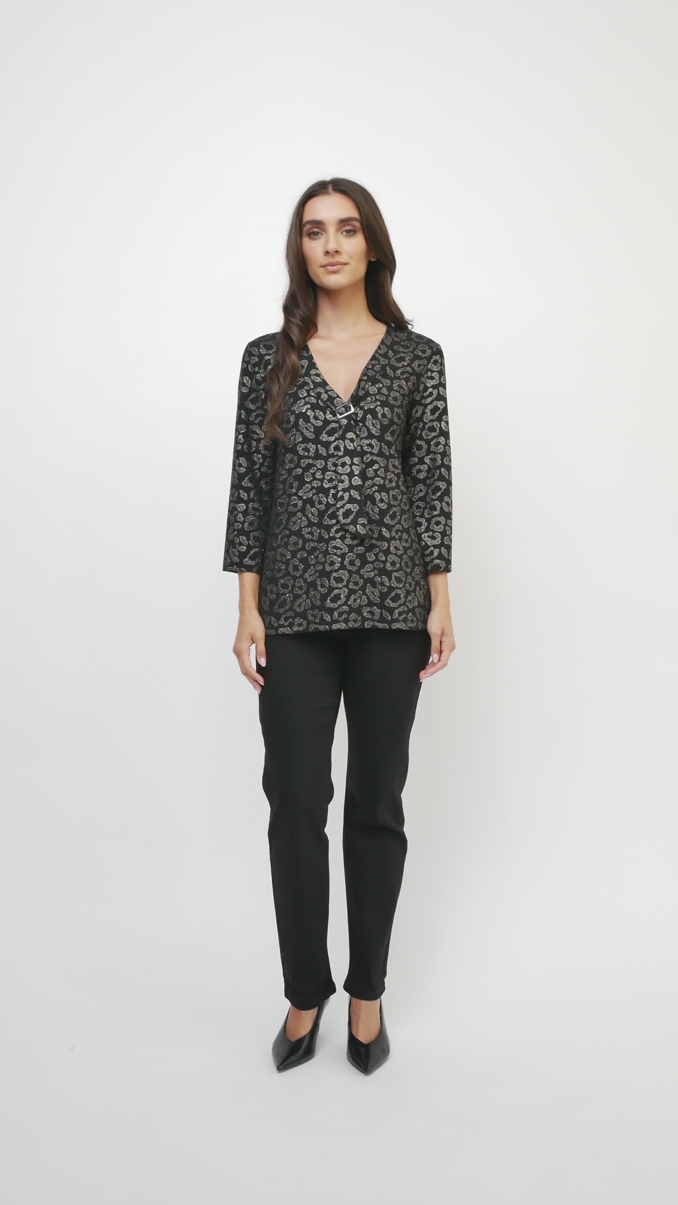Ajoutez une touche d'éclat à votre garde-robe avec ce haut pailleté à imprimé animal, créé en exclusivité pour Cazza Petite & Zacks. Doté de manches 3/4 flatteuses et d'un élégant décolleté en V orné d'un anneau et d'un lien, il allie confort et charme dans une maille douce. Fabriqué fièrement au Canada, ce haut vous permet de briller grâce à de subtiles touches de paillettes tout en restant chic et sans effort. Parfait pour celles qui aiment les paillettes !
