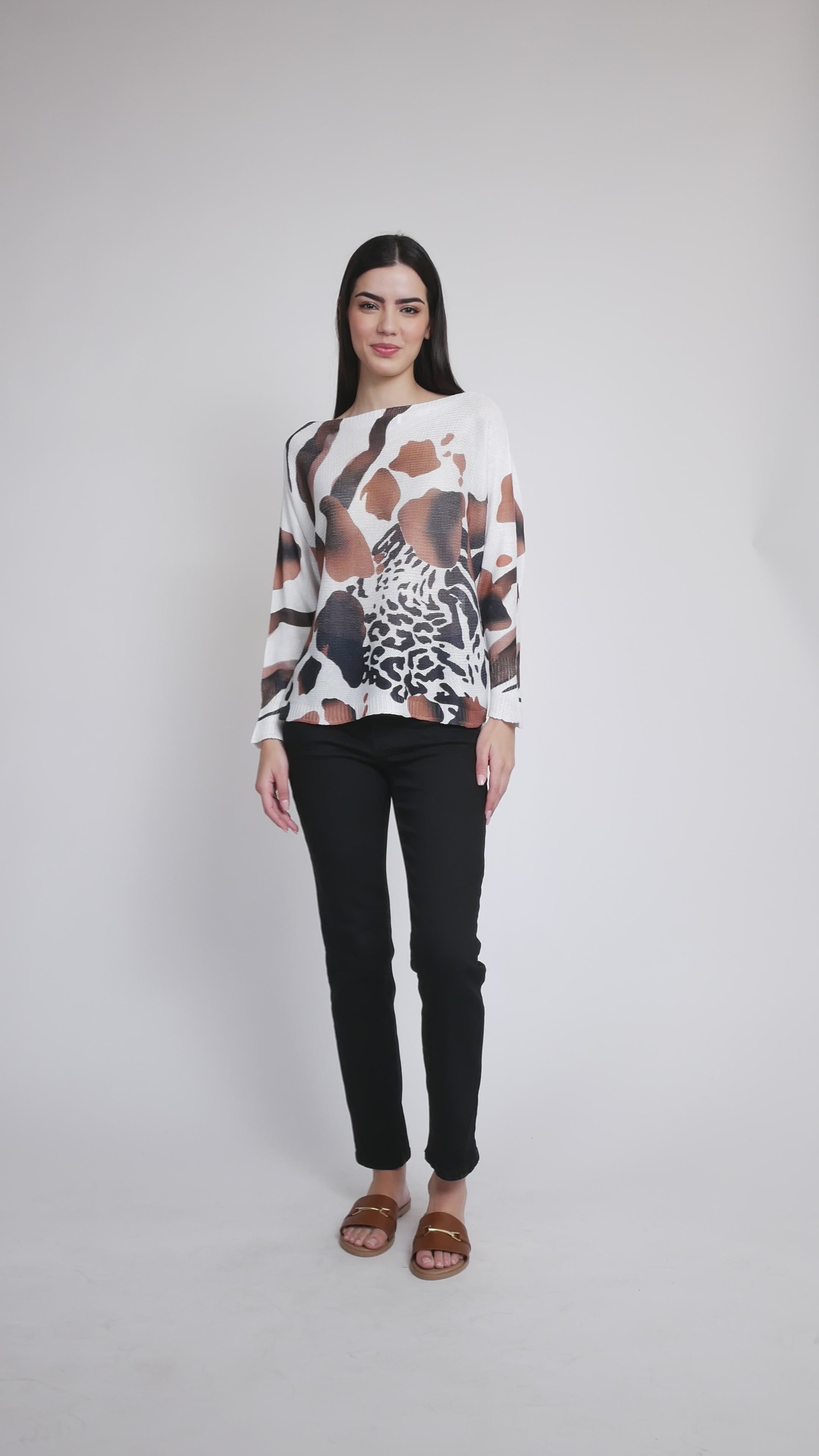 Laissez-vous séduire par l'élégance italienne avec ce ravissant pull à imprimé animal de Via Vitale. Confectionné en Italie dans une maille somptueuse, il présente des manches dolman fluides au drapé impeccable et une encolure rond classique pour un style décontracté. Parfait à superposer ou à porter seul, ce pull apporte une touche d'élégance sauvage à votre garde-robe quotidienne. Un basique intemporel qui sort de l'ordinaire.