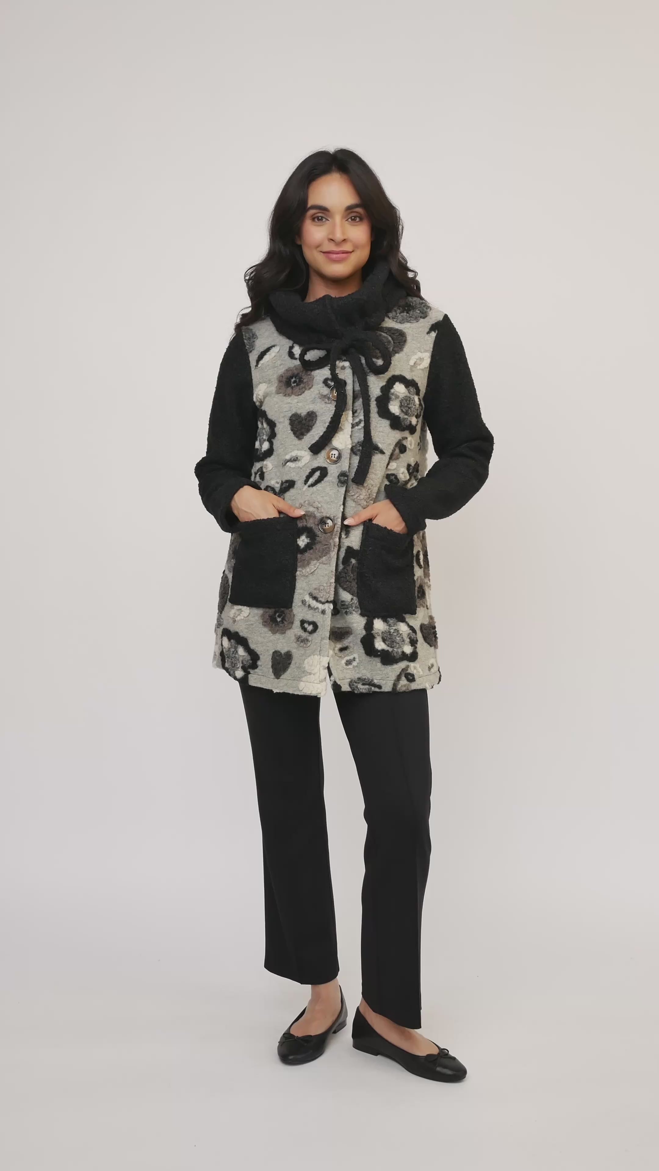 Cette veste en bouclette à broderie florale présente des manches longues et un col châle douillet avec un cordon de serrage amusant. Confectionnée en laine mélangée douce, elle est dotée d'une fermeture boutonnée sur le devant et de poches plaquées pratiques pour plus de charme et de praticité. Confectionnée en Italie par Via Vitale, elle apportera une touche d'élégance à votre garde-robe.