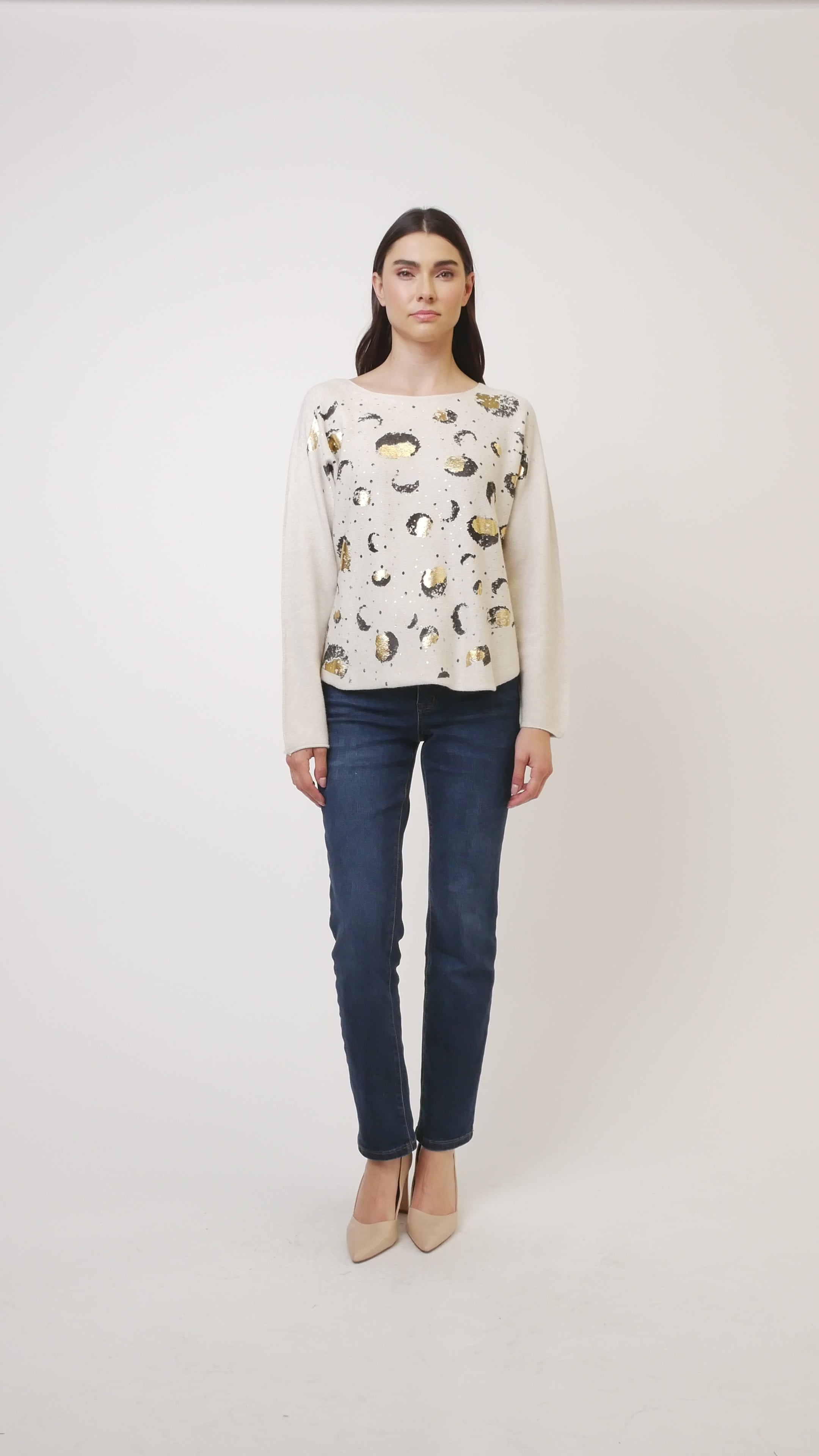 Adoptez une élégance douillette avec ce pull imprimé. Ses longues manches dolman et son décolleté en V flatteur créent une silhouette décontractée et chic, tandis que de subtils détails métallisés apportent une touche scintillante qui reflète parfaitement la lumière. Confectionné en maille douce fabriquée en Italie, il promet confort et élégance, parfait pour illuminer votre journée avec style.