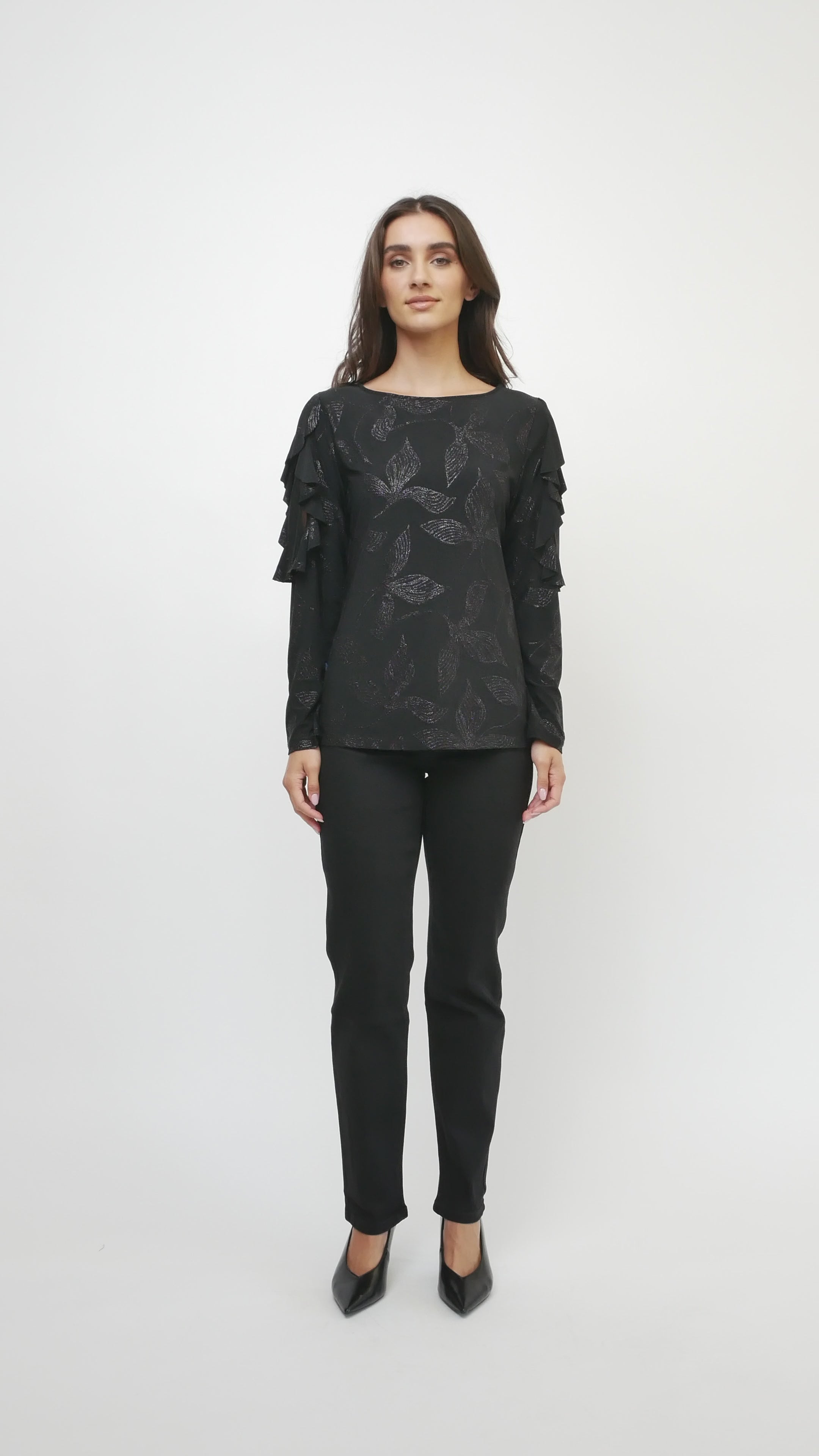 Ajoutez une touche d'éclat à votre journée avec ce haut à manches volantées. Doté d'un tricot douillet et d'une charmante col rond, le délicat détail volanté ajoute une touche de fantaisie à chaque geste. Fabriqué au Canada en exclusivité pour Cazza Petite et Zacks, il allie confort et brillance pour illuminer votre garde-robe ! Disponible en coupe Petite et Régulier.