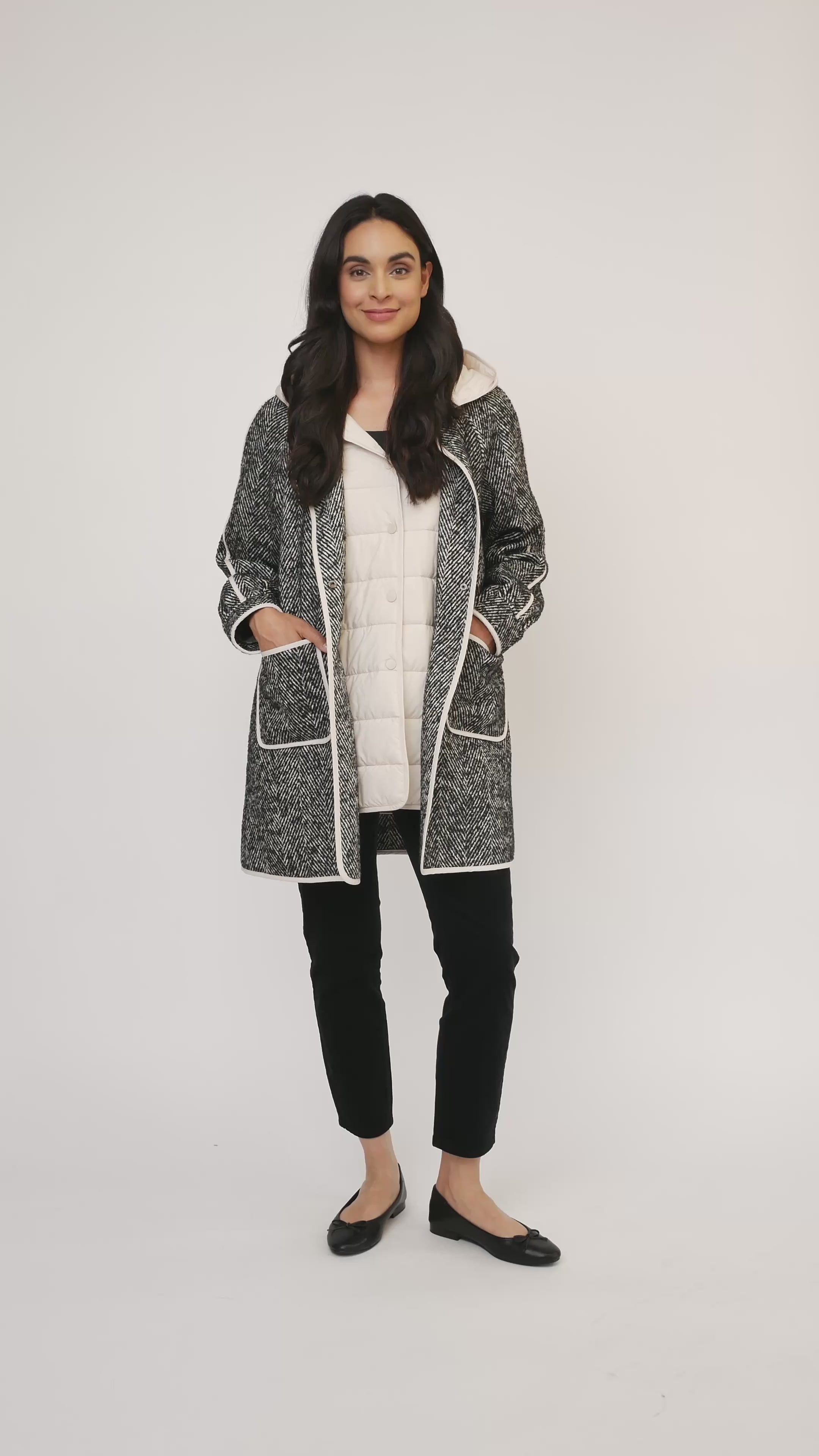 Restez confortable et stylé avec le manteau trompe-l'œil à chevrons Tribal. Confectionné dans un mélange de maille et de tissu matelassé, ce manteau arbore une encolure montante et une capuche pour un charme supplémentaire. Sa fermeture à boutons-pression et ses poches plaquées lui confèrent une touche pratique, tandis que ses finitions contrastées lui apportent une touche d'originalité. Idéal pour les journées fraîches, il apportera une touche de personnalité !