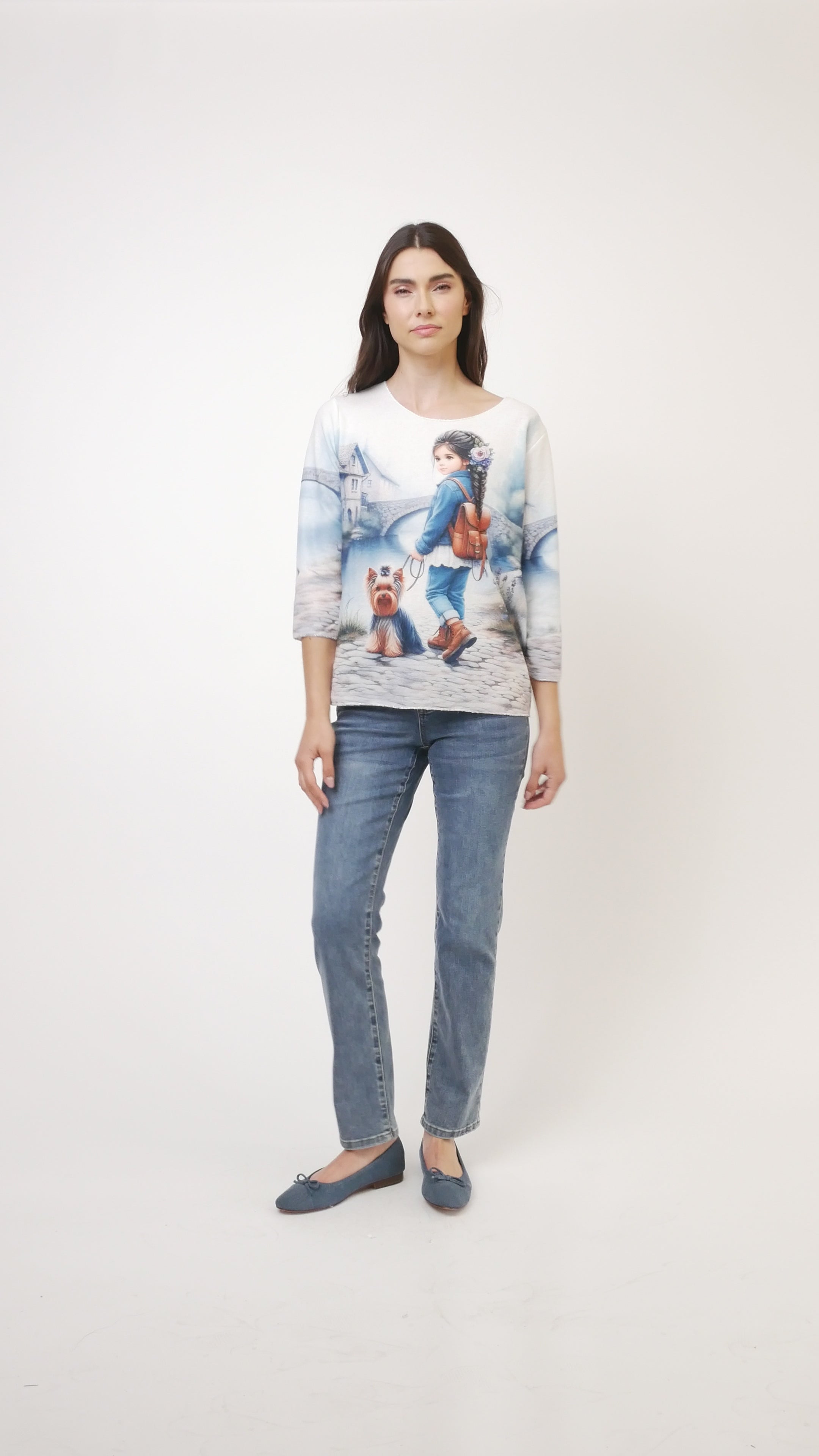Ce haut en maille pour petite fille arbore un adorable imprimé chien, des manches 3/4 et un col rond confortable. Confectionné en Italie dans une maille douce et extensible, il offre une coupe confortable, idéale pour les aventures du quotidien, avec une touche de style et de fantaisie.