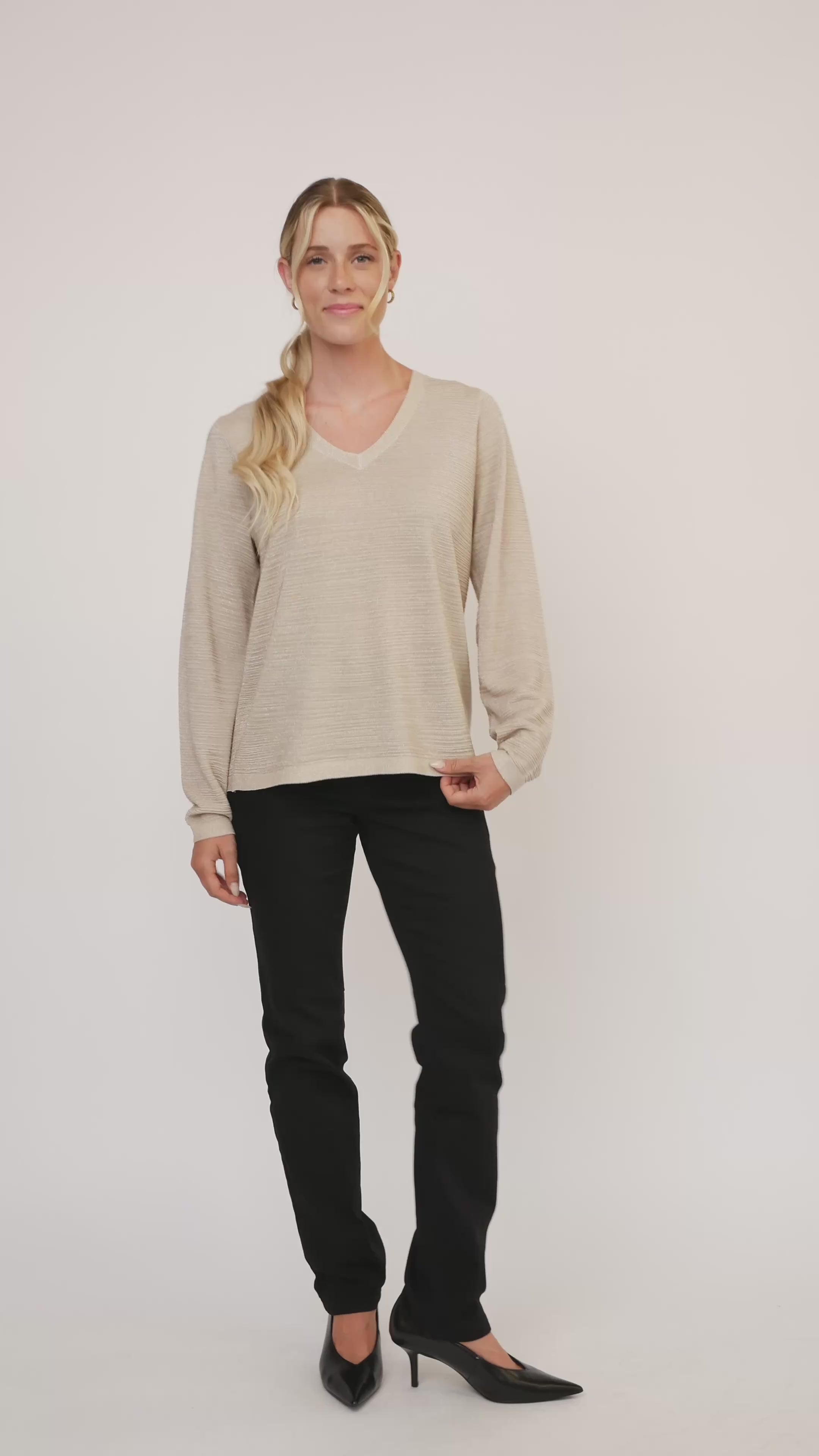 Ce pull à manches longues signé Marina V présente un décolleté en V flatteur et des détails en Lurex scintillants qui ajoutent une touche d'éclat à votre look. Confectionné en maille douce et texturée, il offre un confort douillet avec une touche d'élégance, idéale pour égayer n'importe quelle tenue.