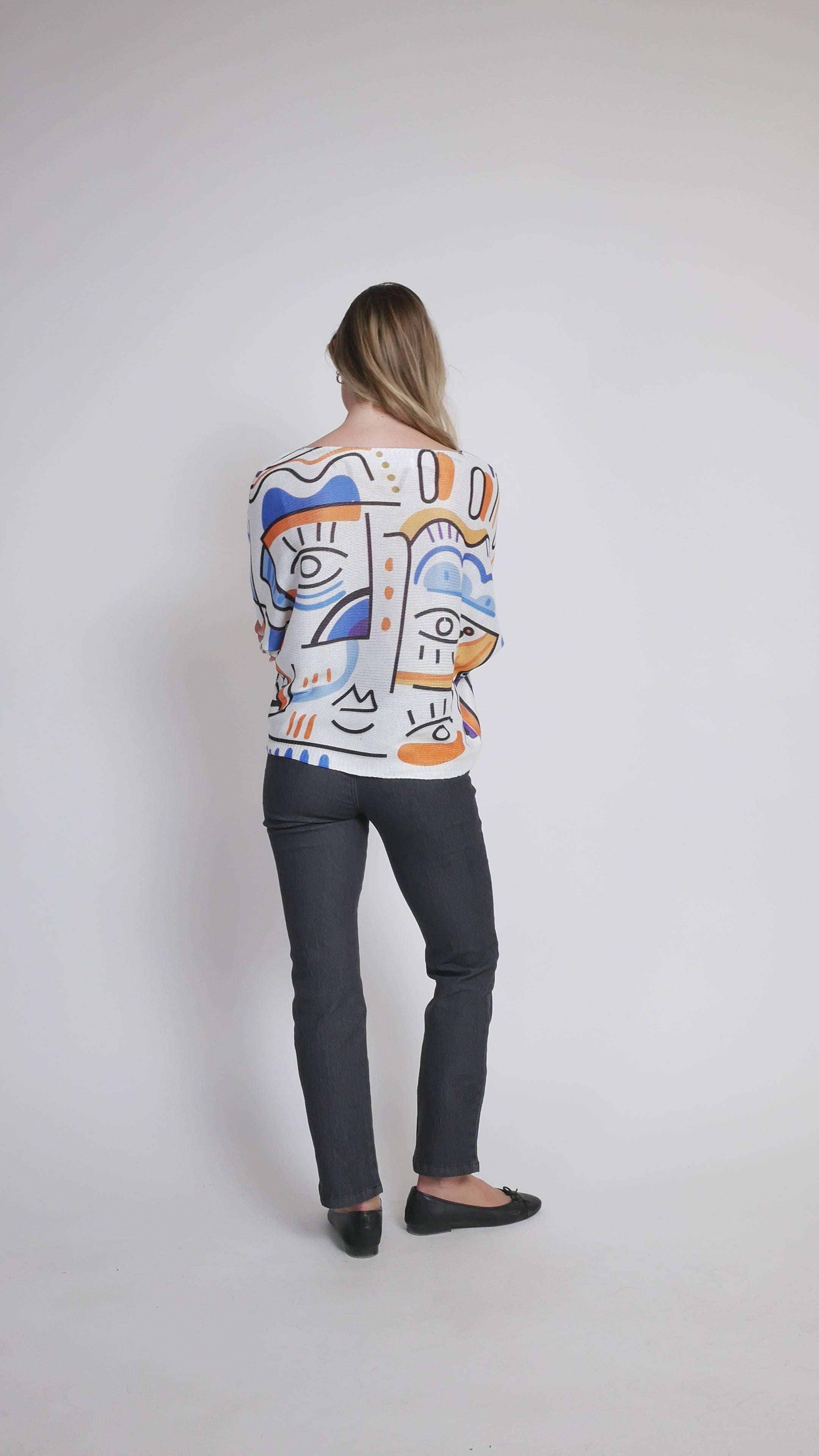 Laissez s'exprimer l'artiste qui sommeille en vous avec ce ravissant pull imprimé Picasso de Via Vitale. Confectionné en Italie dans une maille luxueuse, il présente un décolleté en V flatteur et des manches dolman fluides qui épousent les formes avec élégance. Idéal pour apporter une touche de créativité à votre garde-robe quotidienne – car la vie est trop courte pour les basiques ennuyeux.