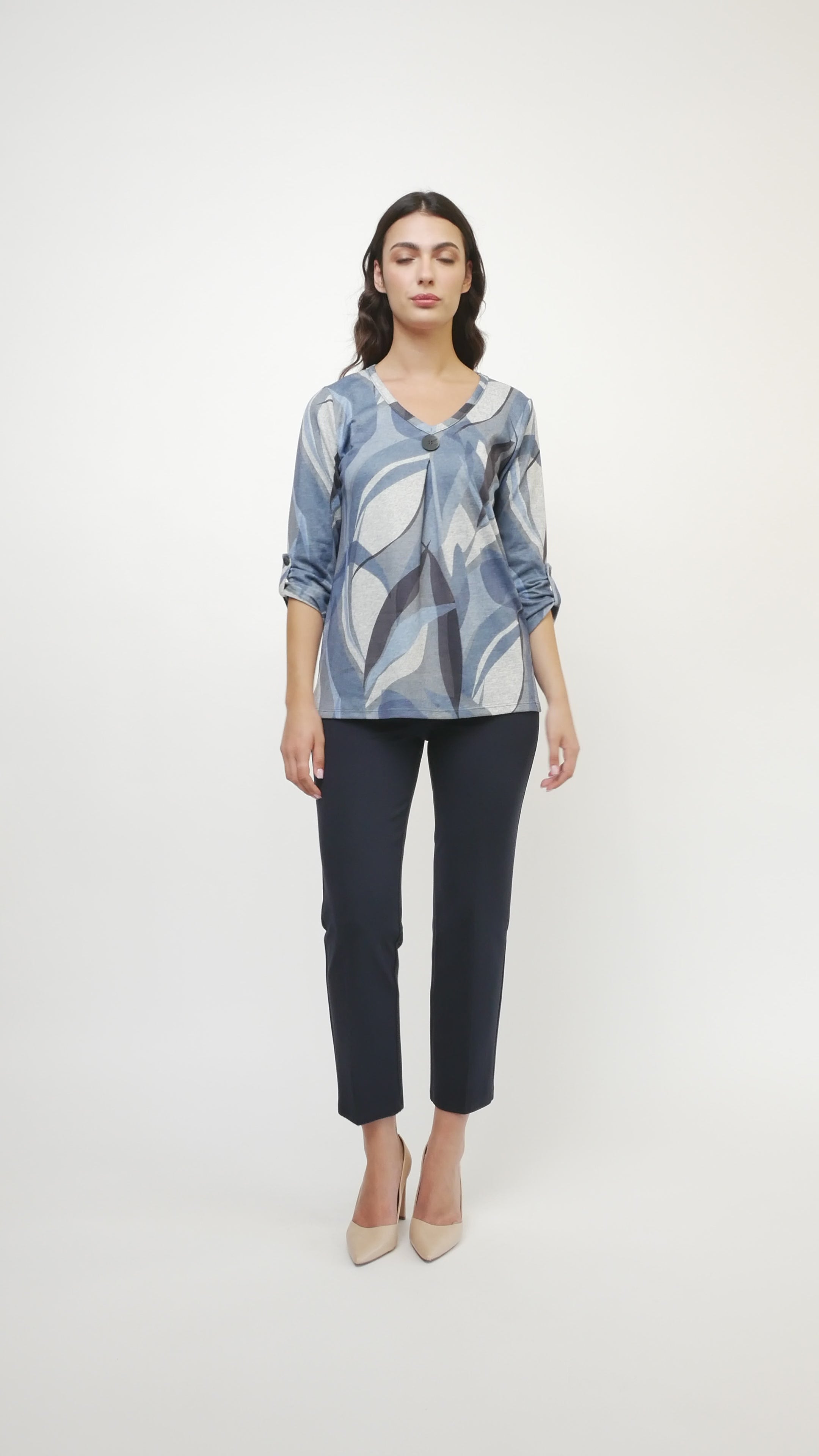 Cette tunique en tricot imprimé présente une encolure en V flatteuse, de charmants boutons et des manches 3/4 ornées d'une élégante patte. Confectionnée en tricot doux, elle offre confort et légèreté au quotidien. Fièrement fabriquée au Canada et disponible en exclusivité chez Cazza Petite & Zacks, elle est un ajout original à votre garde-robe, aussi unique que vous.