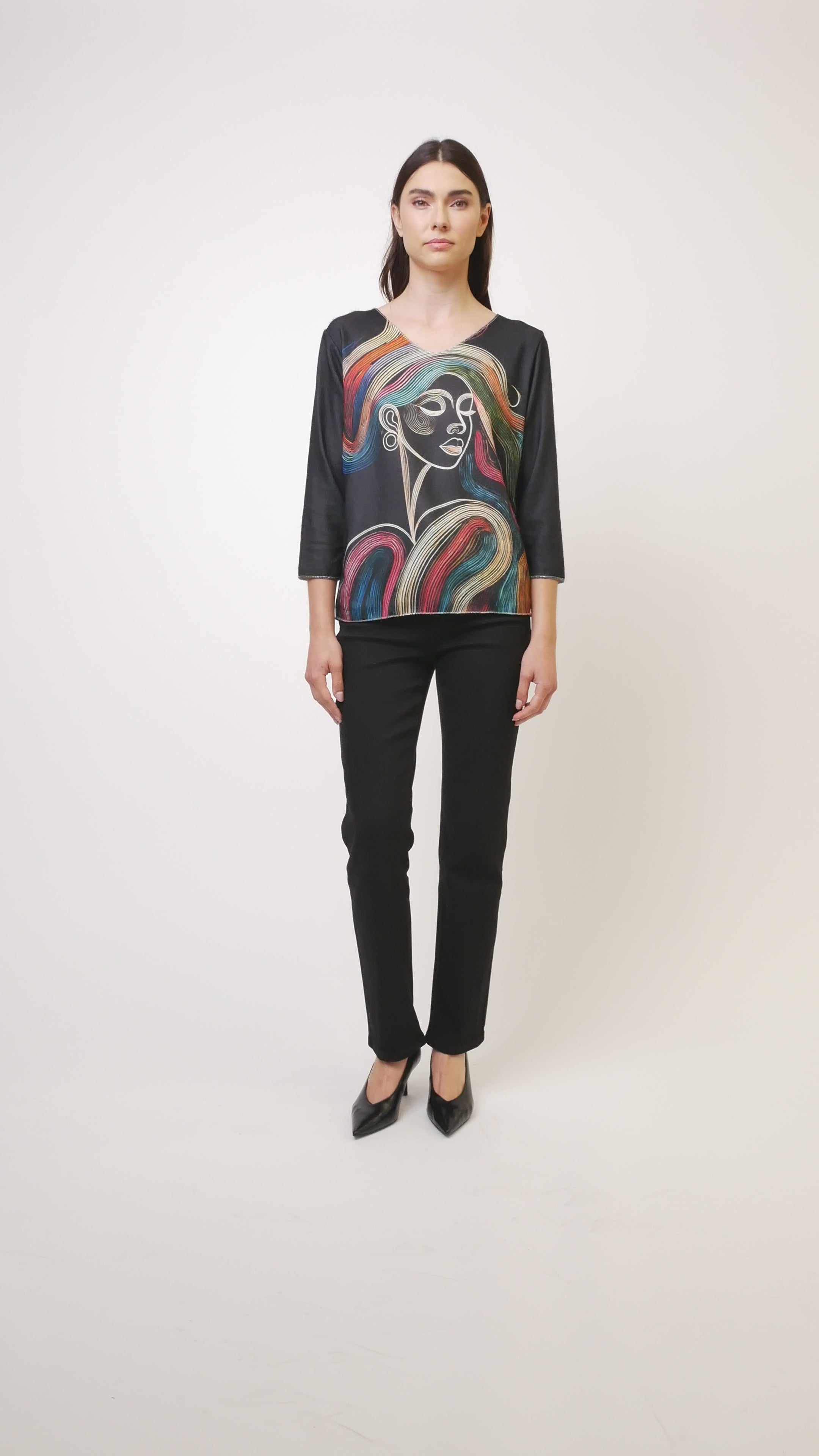 Adoptez un charme naturel avec ce pull à imprimé muse aux lignes rayonnantes. Confectionné en maille extensible douce fabriquée en Italie, il offre un confort douillet et une touche ludique. Son décolleté en V flatteur et ses manches 3/4 apportent la touche de séduction idéale pour illuminer votre journée.