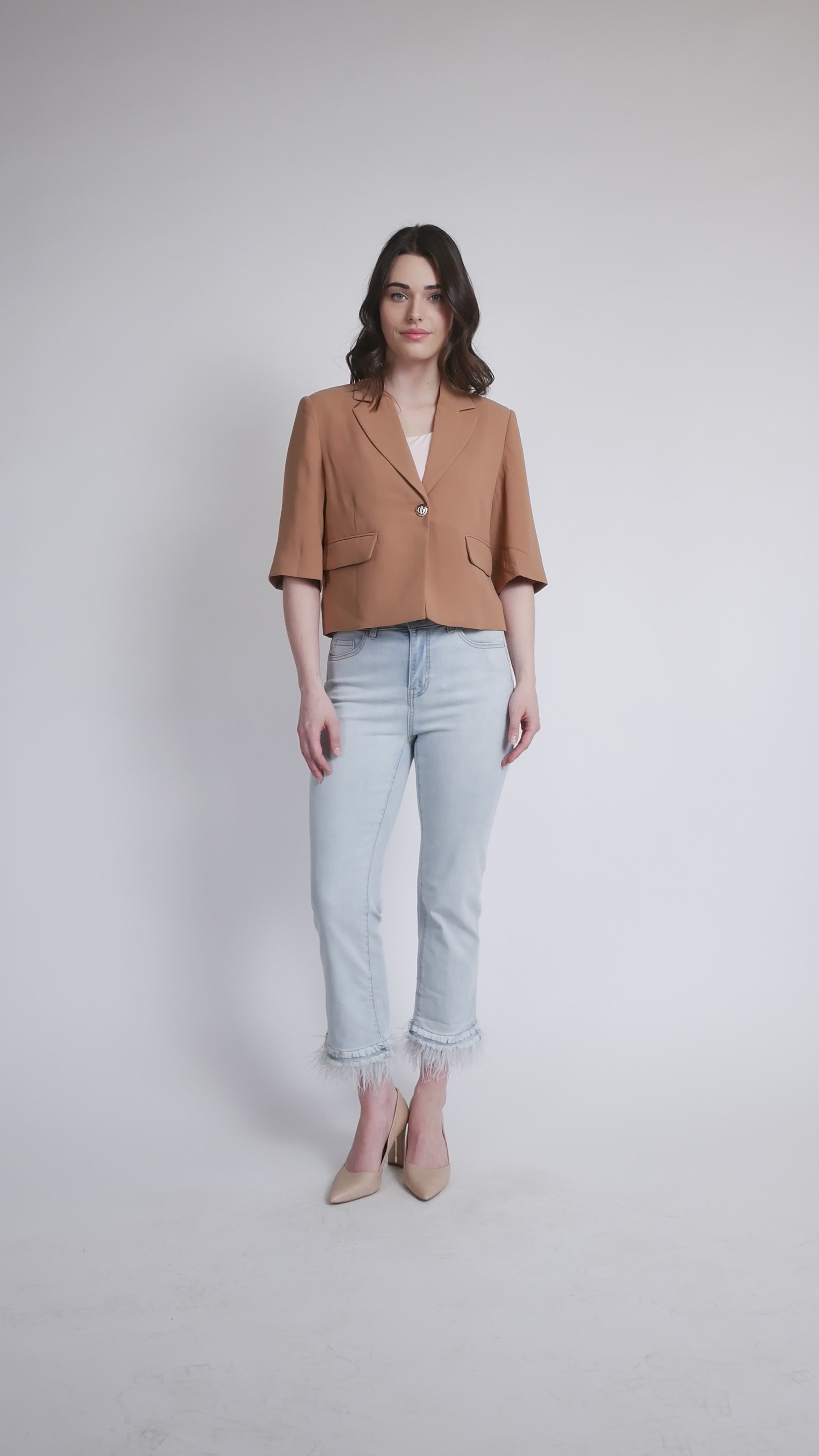 Enfilez ce blazer court chic et rehaussez instantanément votre style. Confectionné en crêpe luxueux, il présente un col cranté élégant, des poches à rabat pratiques et une fermeture à un bouton pour une allure décontractée et stylée. Ses manches trois-quarts apportent une touche de modernité, tandis que sa doublure assure un confort optimal tout au long de la journée. Parfait à superposer à votre t-shirt ou robe préférée, ce blazer Esqualo deviendra votre indispensable pour un look soigné sans effort.