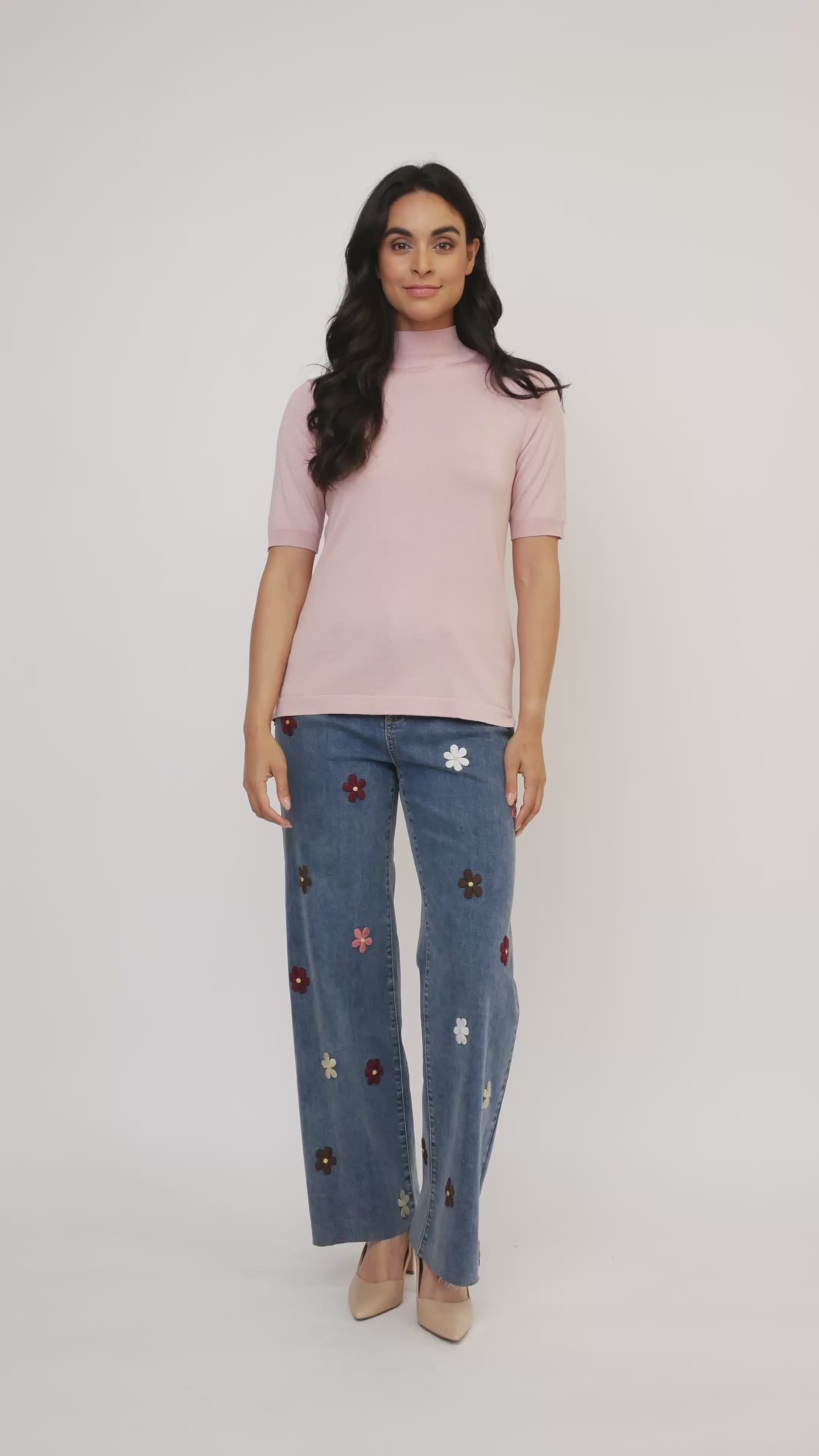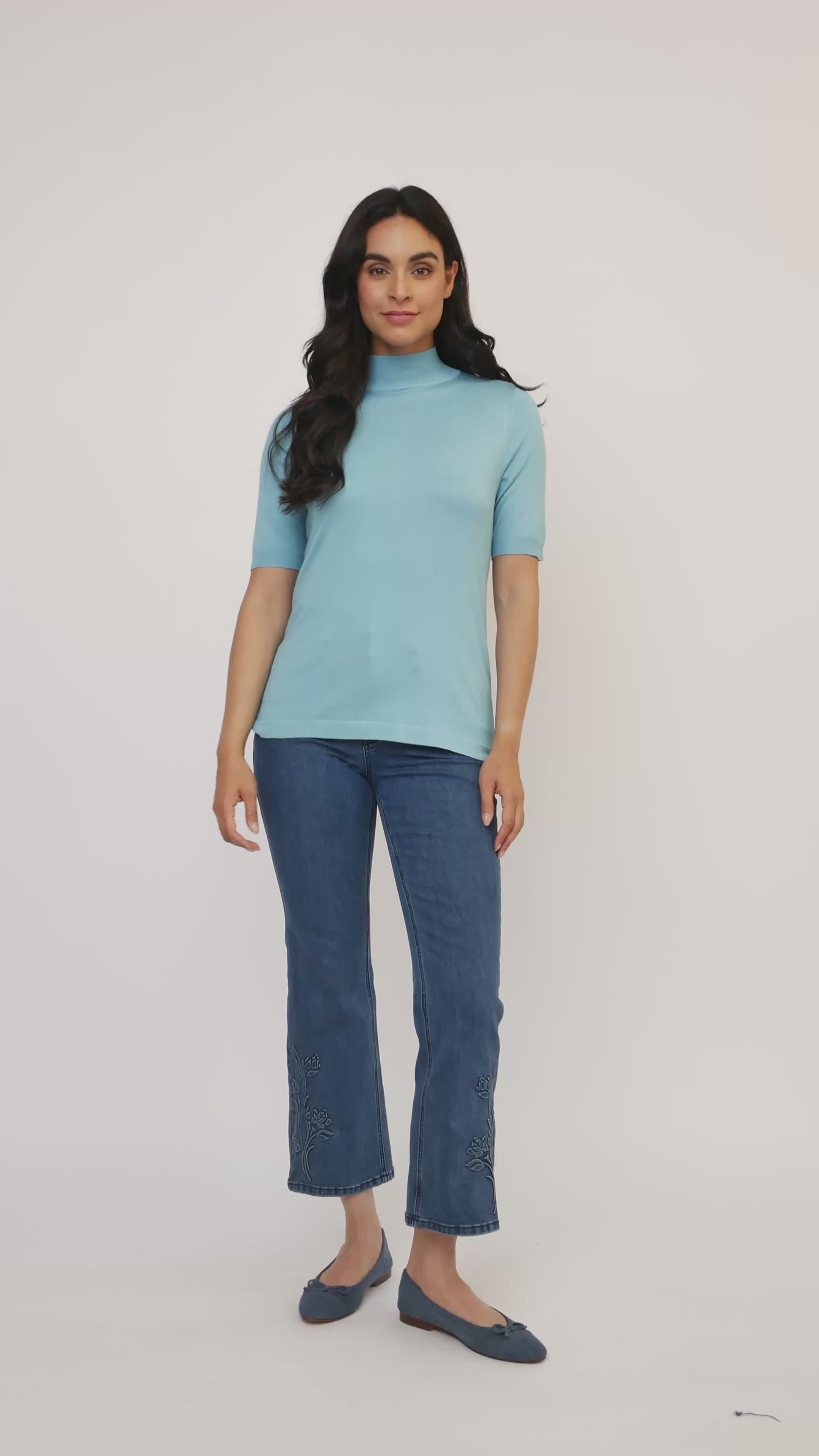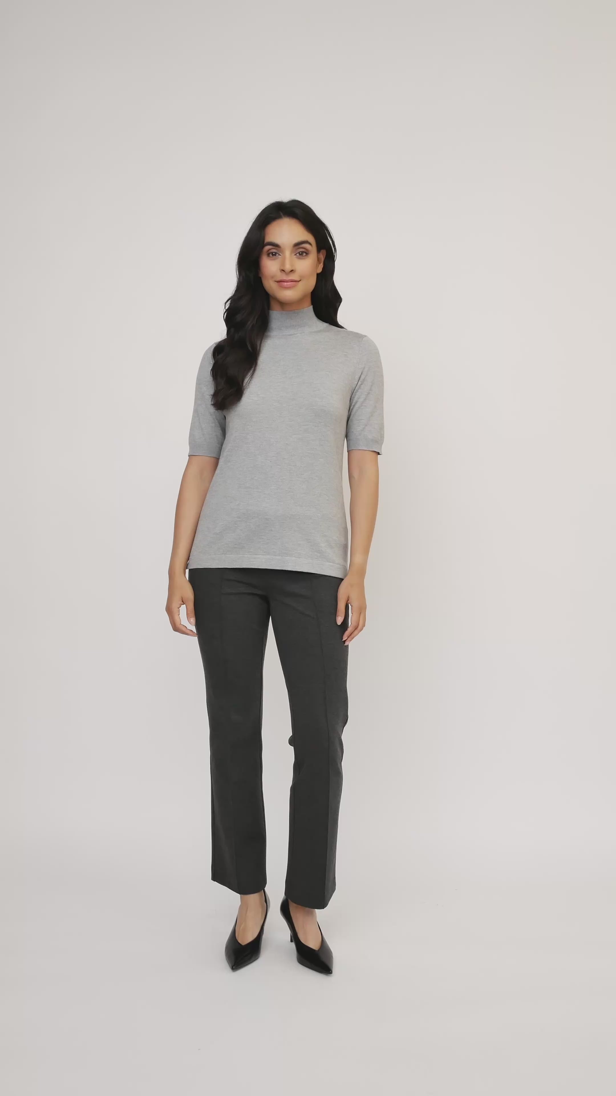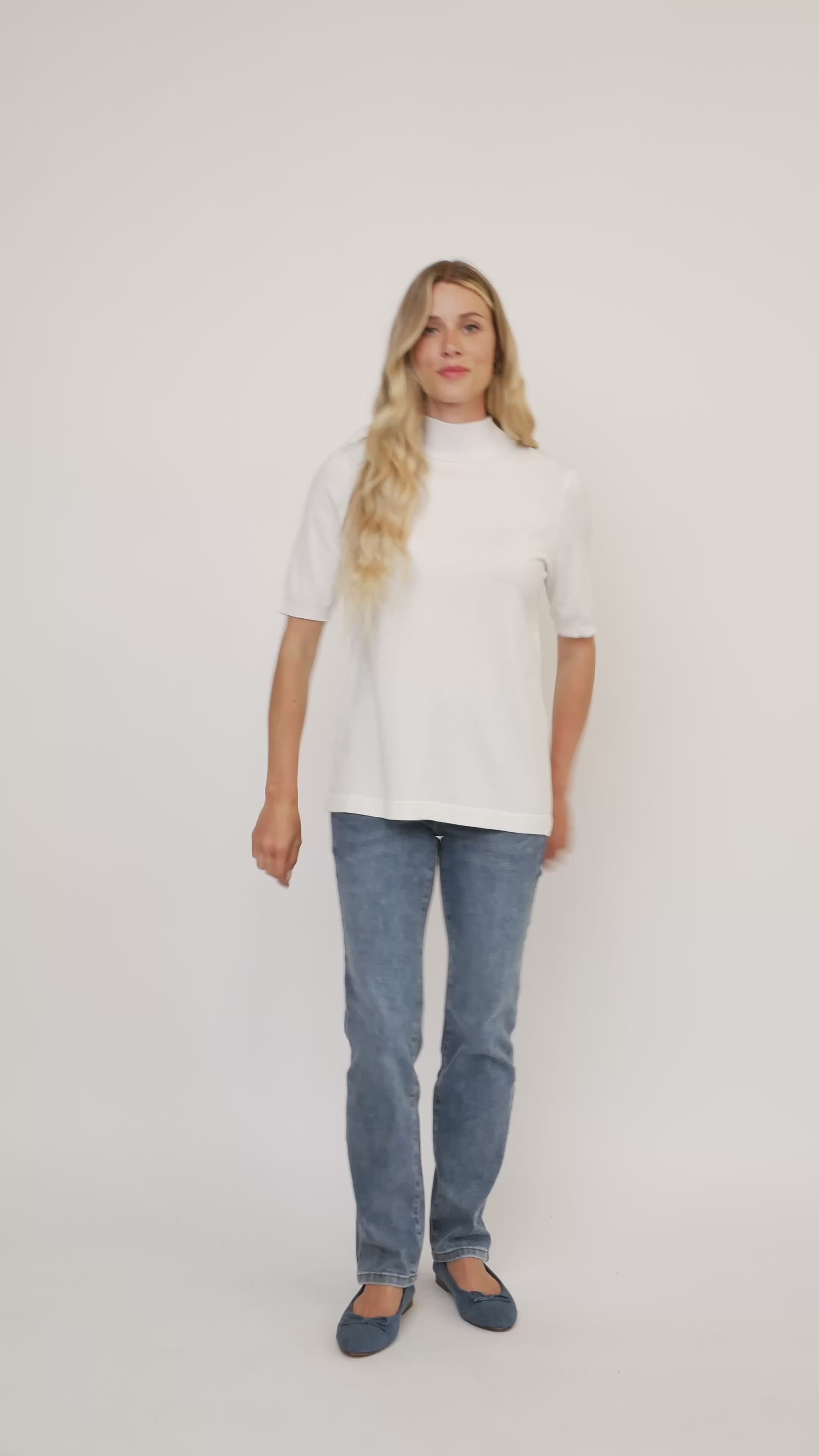 Ce pull à col montant uni de Jac Dale présente un tissu en tricot doux et confortable et un design chic à manches courtes, parfait pour superposer ou porter seul pour un look élégant.