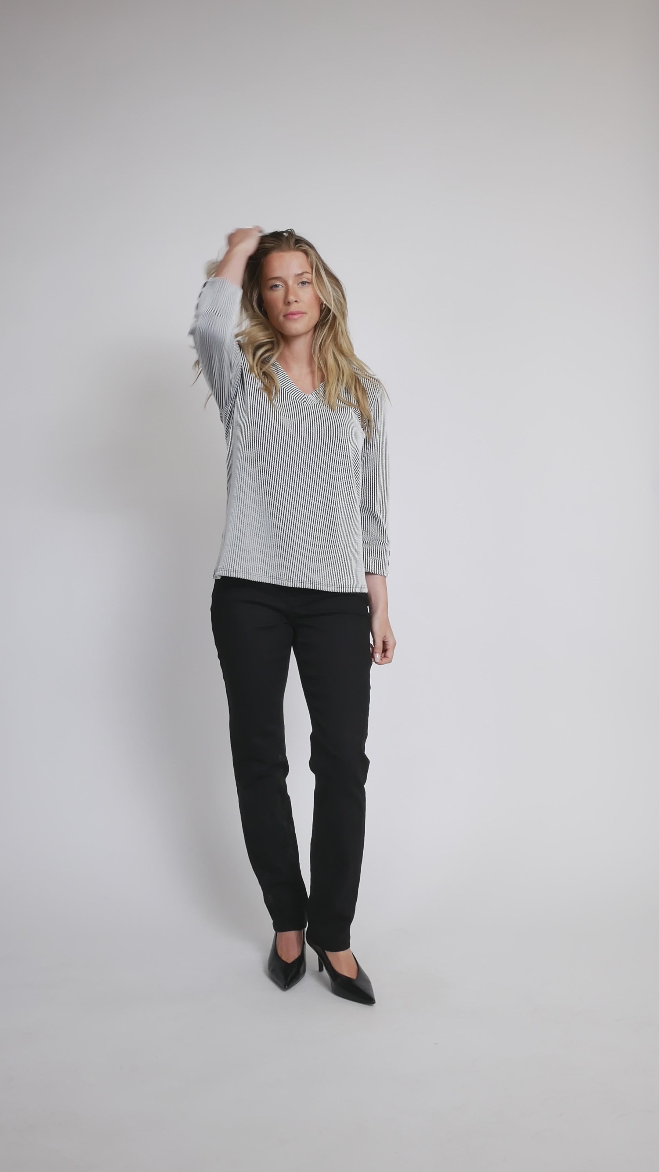 Rehaussez votre style au quotidien avec ce charmant haut côtelé bicolore. Doté d'un décolleté en V flatteur et de manches 3/4 boutonnées, ce modèle en maille offre un équilibre parfait entre décontraction et élégance. Confectionné ici même au Canada pour Cazza Petite et Zacks avec soin et qualité, c'est un indispensable polyvalent qui se porte aussi bien seul que superposé. Simple, stylé et parfaitement ajusté.