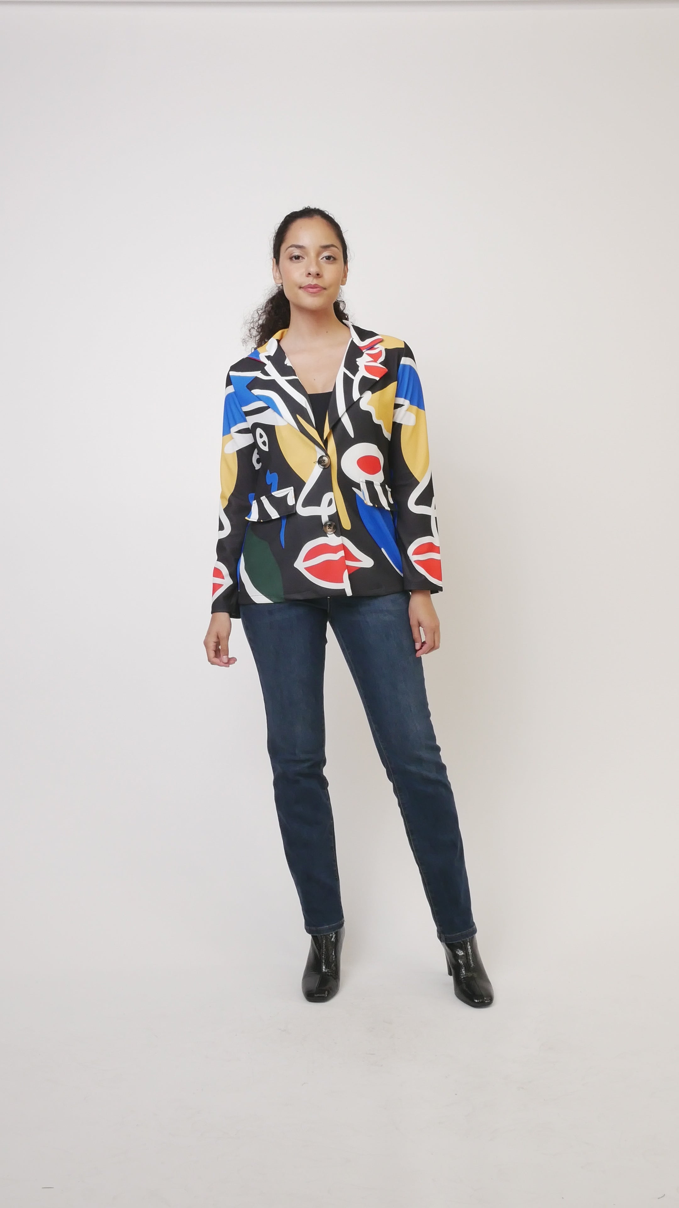 Adoptez le style avec ce blazer artistique facile à porter, confectionné en maille scuba douce et fabriqué en Italie. Doté d'un col cranté, d'une fermeture à deux boutons et de charmantes poches à rabat, il est doublé pour plus de confort et conçu pour égayer n'importe quelle tenue d'une touche de fantaisie. Parfait pour ajouter une touche d'élégance à votre look quotidien !