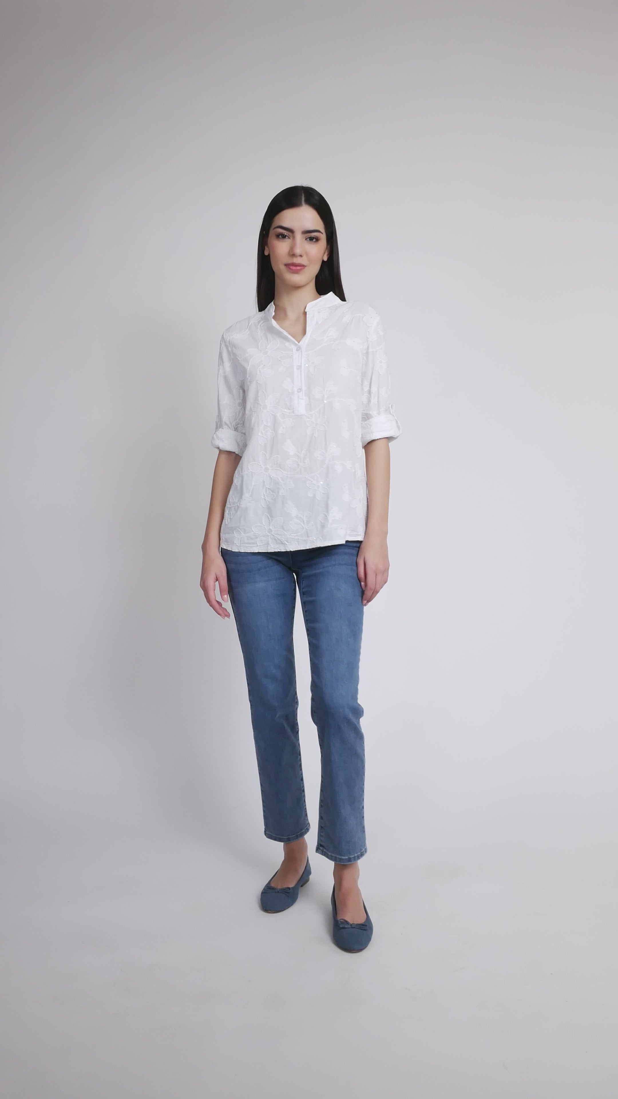 Chic et facile à porter, cette blouse en coton de Via Vitale apporte une touche d'élégance italienne à votre garde-robe quotidienne. Son charmant col Henley est orné de boutons, tandis que de délicates broderies lui confèrent une personnalité unique. Les manches trois-quarts, dotées d'une patte de boutonnage pratique, ajoutent une note originale, et l'ourlet arrondi dessine une silhouette flatteuse et moderne. Confectionné en coton doux et fabriqué en Italie, cette blouse deviendra vite votre indispensable.