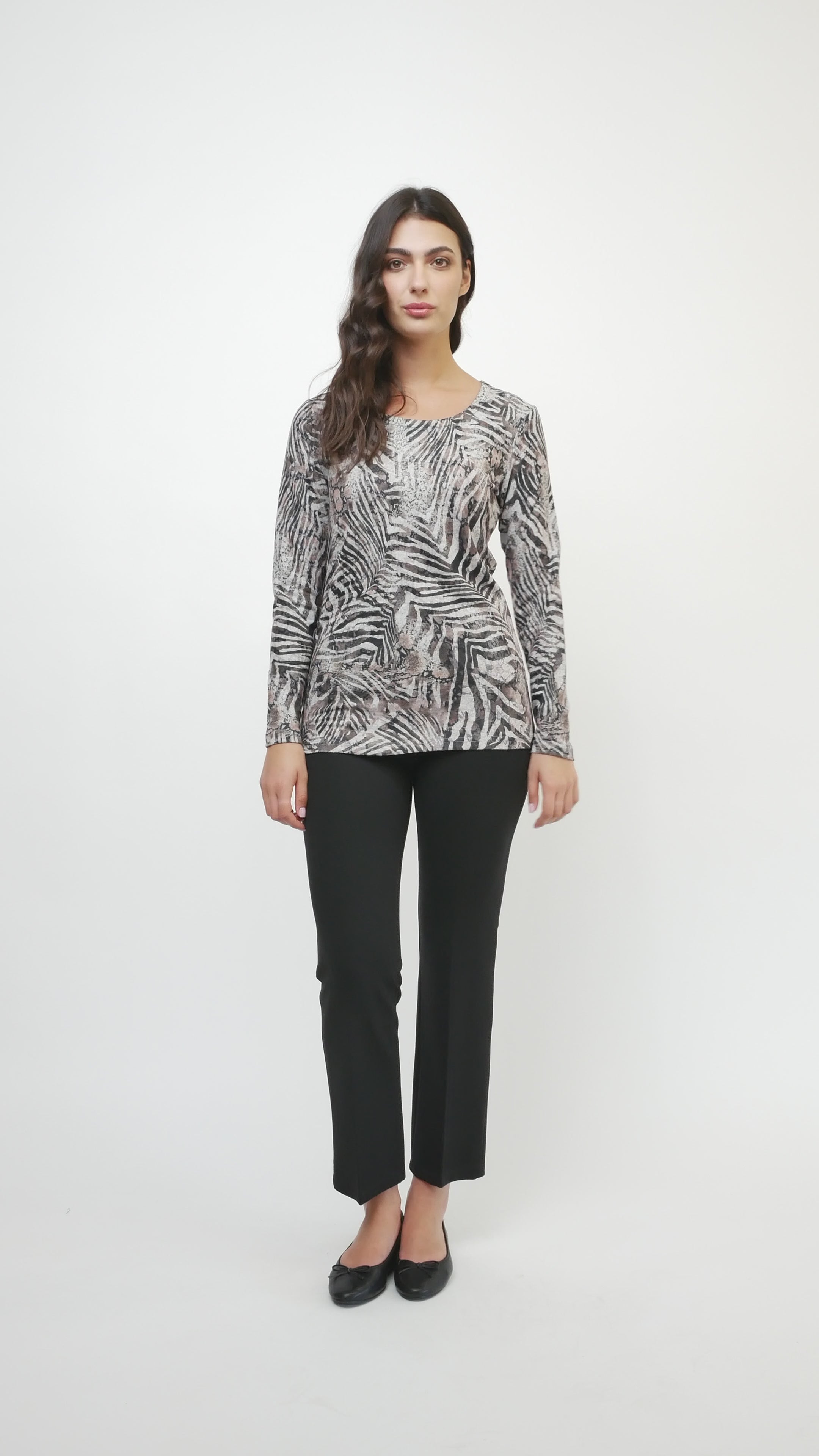 Ce haut de la collection Vex arbore un imprimé zèbre et fleuri dynamique qui apporte une touche de fantaisie à votre garde-robe. Avec ses manches longues et son col rond confortable, il est parfait à superposer ou à porter seul. Sa maille douce assure un confort douillet tout en conservant une élégance naturelle.