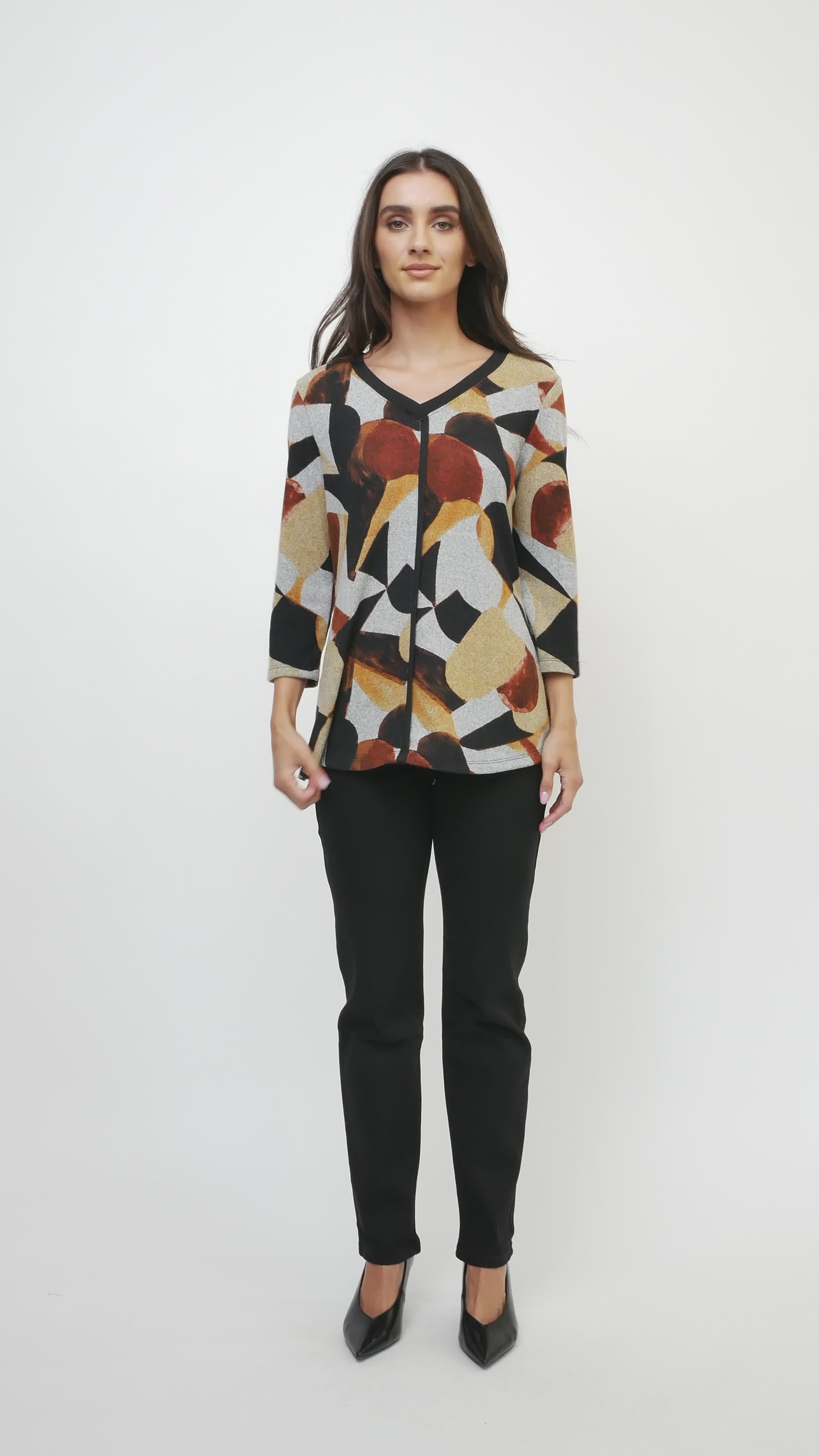 This abstract design top features 3/4 sleeves and a flattering V-neckline, crafted from soft knit fabric for all-day comfort. Proudly made in Canada exclusively for Cazza Petite & Zacks, it's the perfect blend of unique style and cozy wearability to brighten your wardrobe.
