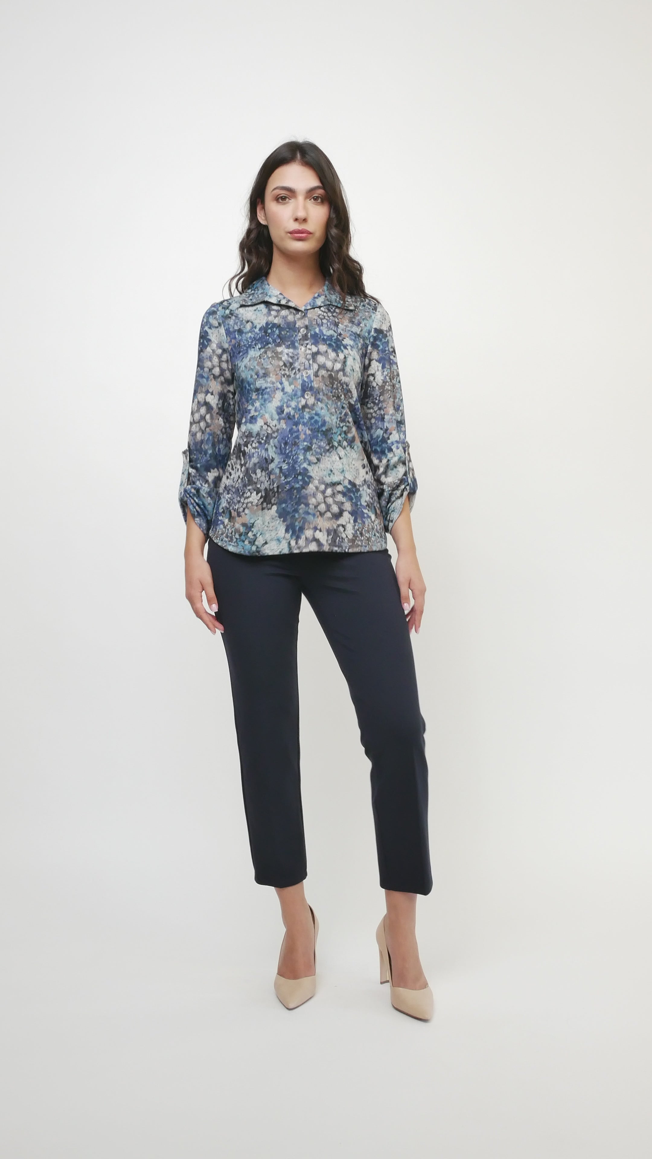 This blouse features 3/4 sleeves with a chic tab detail for effortless roll-up style. A classic shirt collar and half-placket buttons add a touch of casual sophistication. Crafted from soft knit fabric, it’s comfortable and easy to wear all day. Proudly made in Canada exclusively for Cazza Petite & Zacks, this abstract print piece is perfect for adding a stylish twist to your wardrobe.