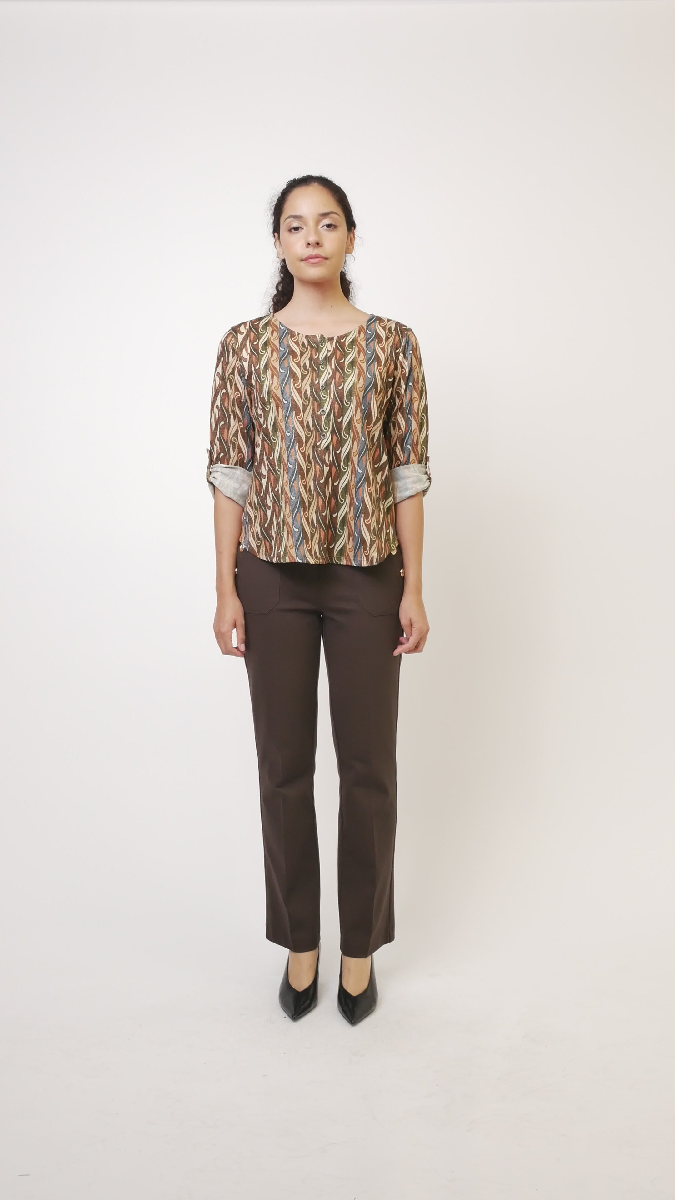 This abstract print top dazzles with 3/4 sleeves finished with a handy tab and a Henley neckline accented by charming button details. Crafted from soft Italian knit fabric, it sparkles subtly with delicate lurex threads, adding just the right amount of shimmer to brighten your day. Perfect for mixing comfort with a touch of glam!