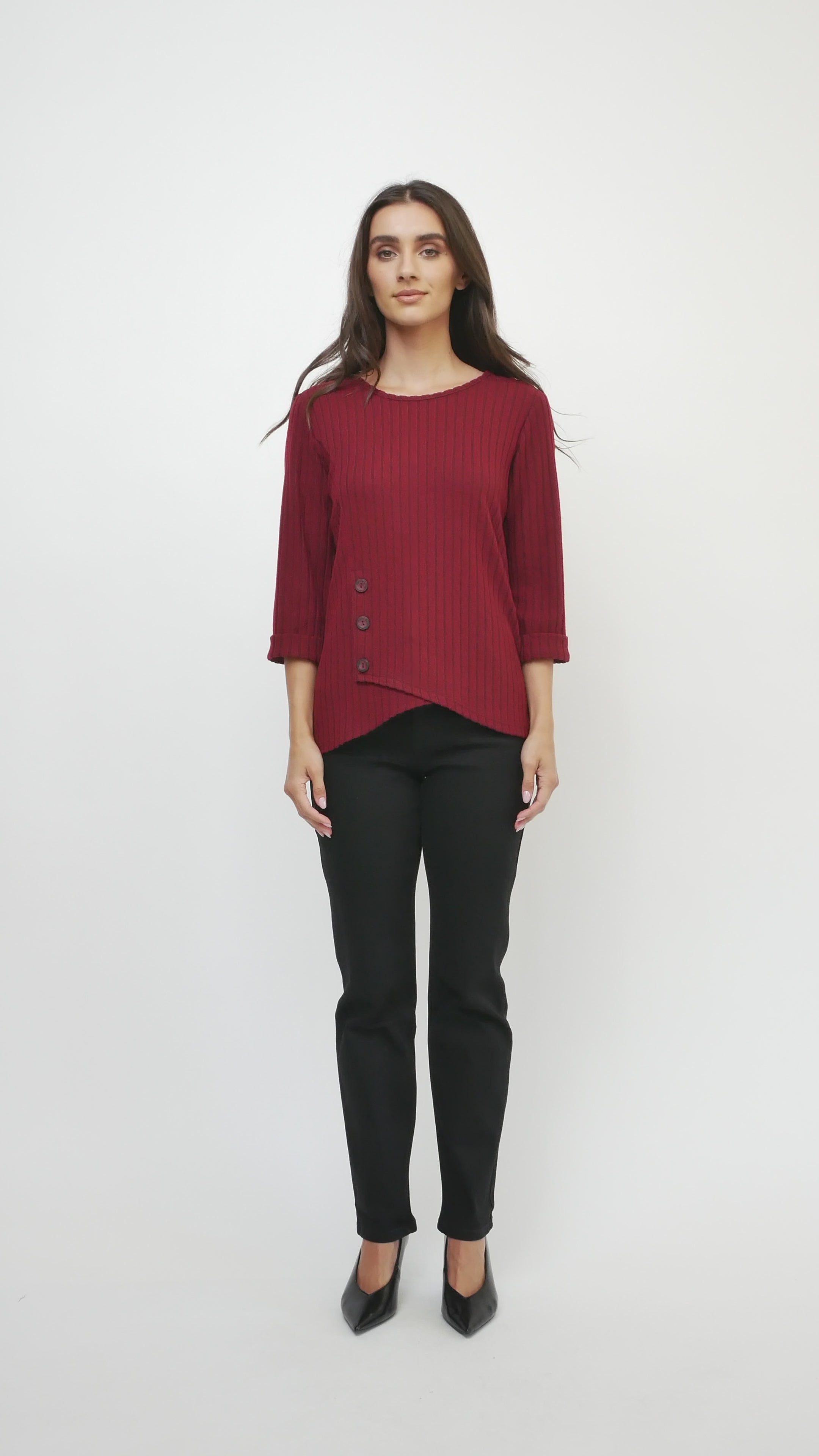 Bring a fresh twist to your wardrobe with this top featuring an asymmetric front and charming three-button detail. Crafted from cozy knit fabric, it offers comfy 3/4 sleeves with cuff accents and a classic crew neckline. Proudly made in Canada, this exclusive piece from Cazza Petite and Zacks adds unique flair to your everyday look.