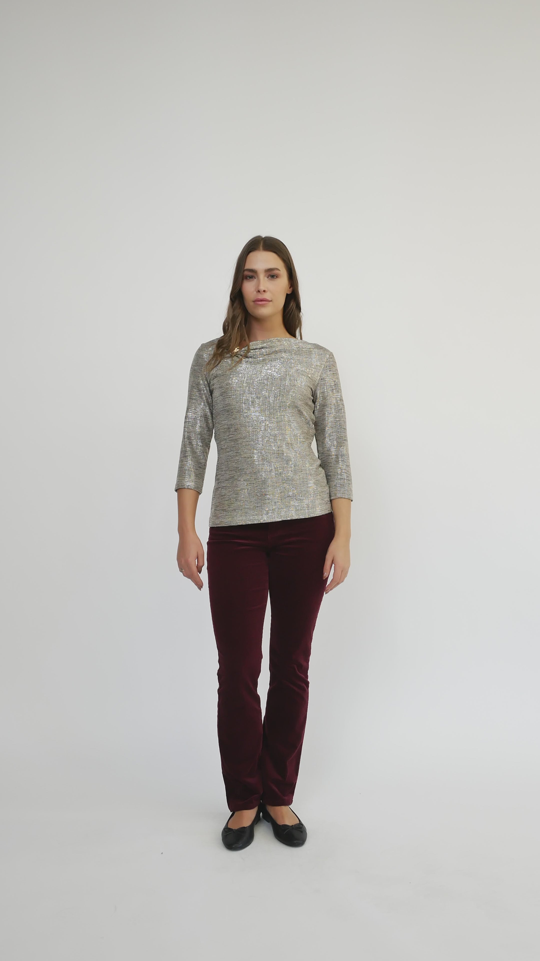This 3/4 sleeve top combines a chic asymmetric V-neckline with a unique buckle detail that adds a fun twist. Crafted from soft knit fabric with shimmering foil pleats, it brings subtle shine and texture to your look. Made in Canada exclusively for Cazza Petite and Zacks, it’s a stylish pick for adding flair to any outfit.