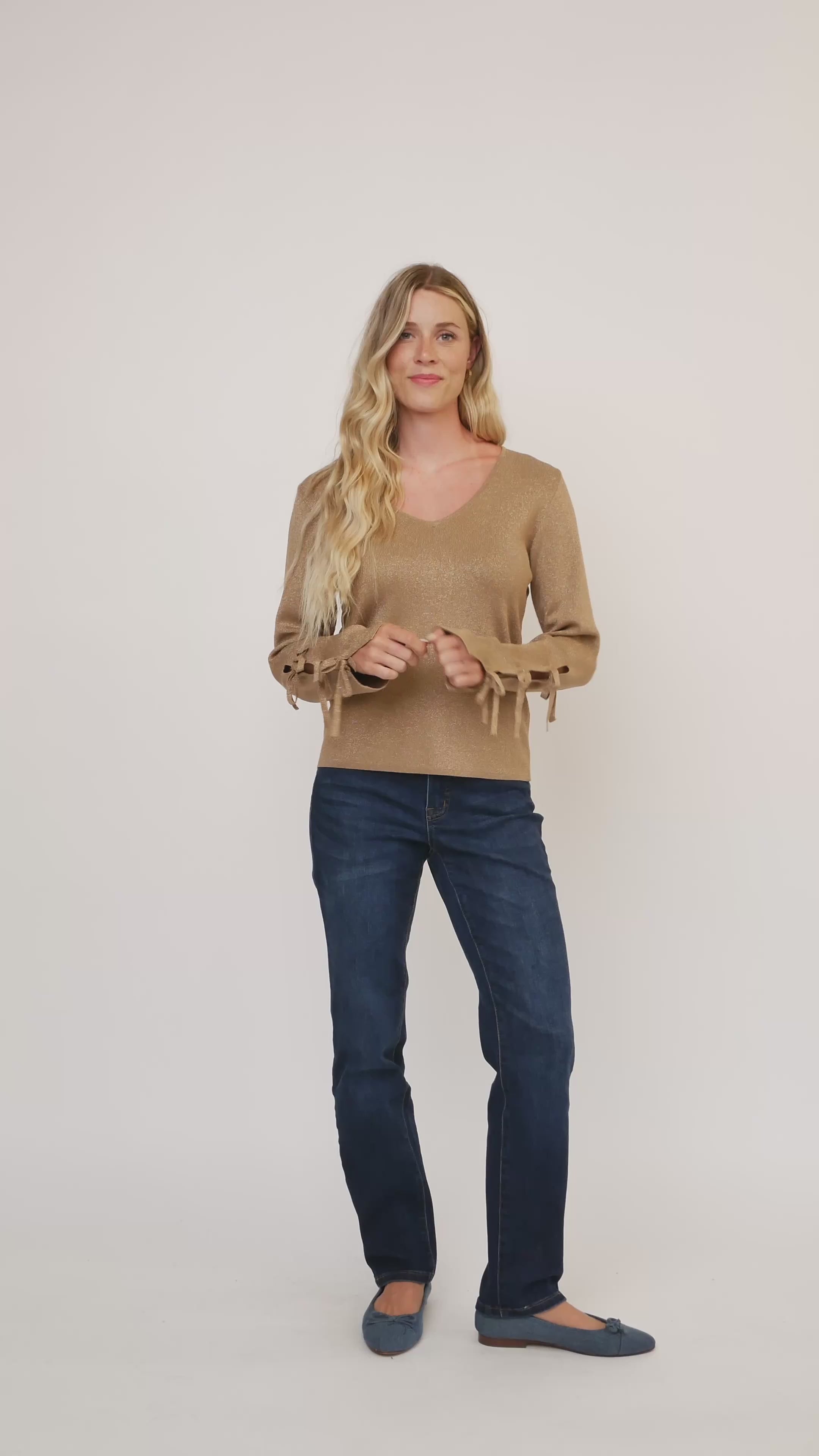This sweater by Marina V features charming bow details on long sleeves and a flattering V-neckline. Crafted from soft knit fabric with subtle lurex accents, it adds a touch of sparkle to your cozy look. Perfect for brightening up chilly days with a fun, feminine twist.