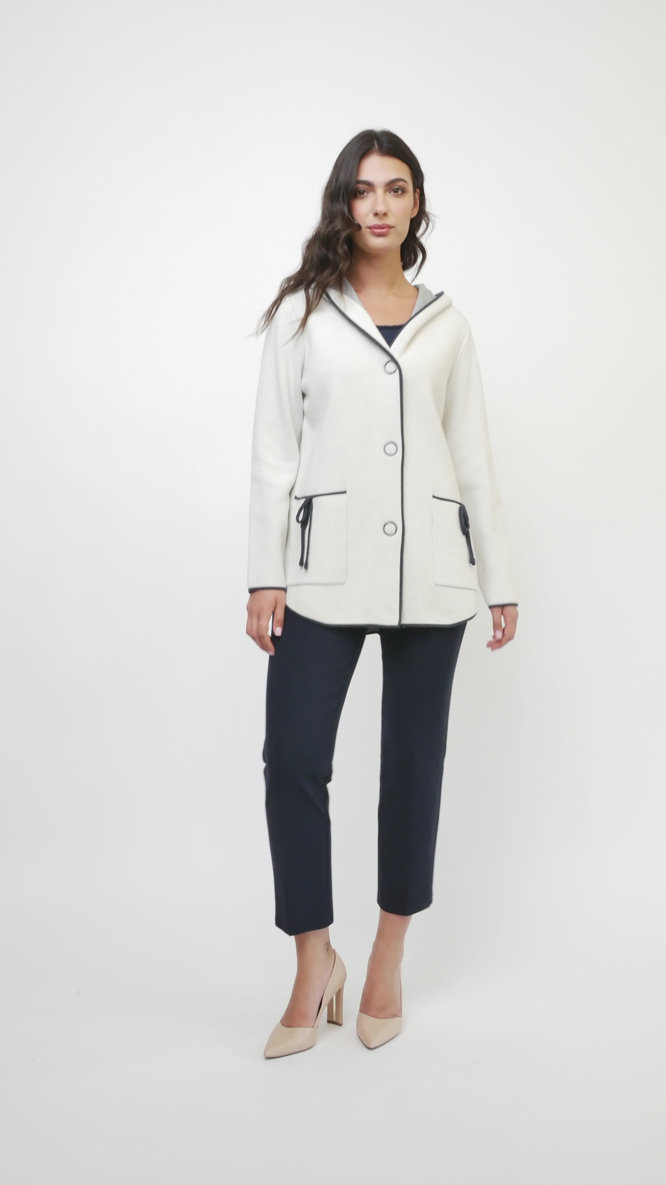 Stay cozy and stylish in this long sleeve cardigan by Jac Dale. Featuring a stand-up collar with a hood and a snap front for easy wear, it adds a fun twist with a crisscross back detail. The patch pockets with a charming bow and contrast trim bring extra flair, all crafted from soft knit fabric for comfort. Perfect for layering with a touch of whimsy! Available in Petite and Regular fit.