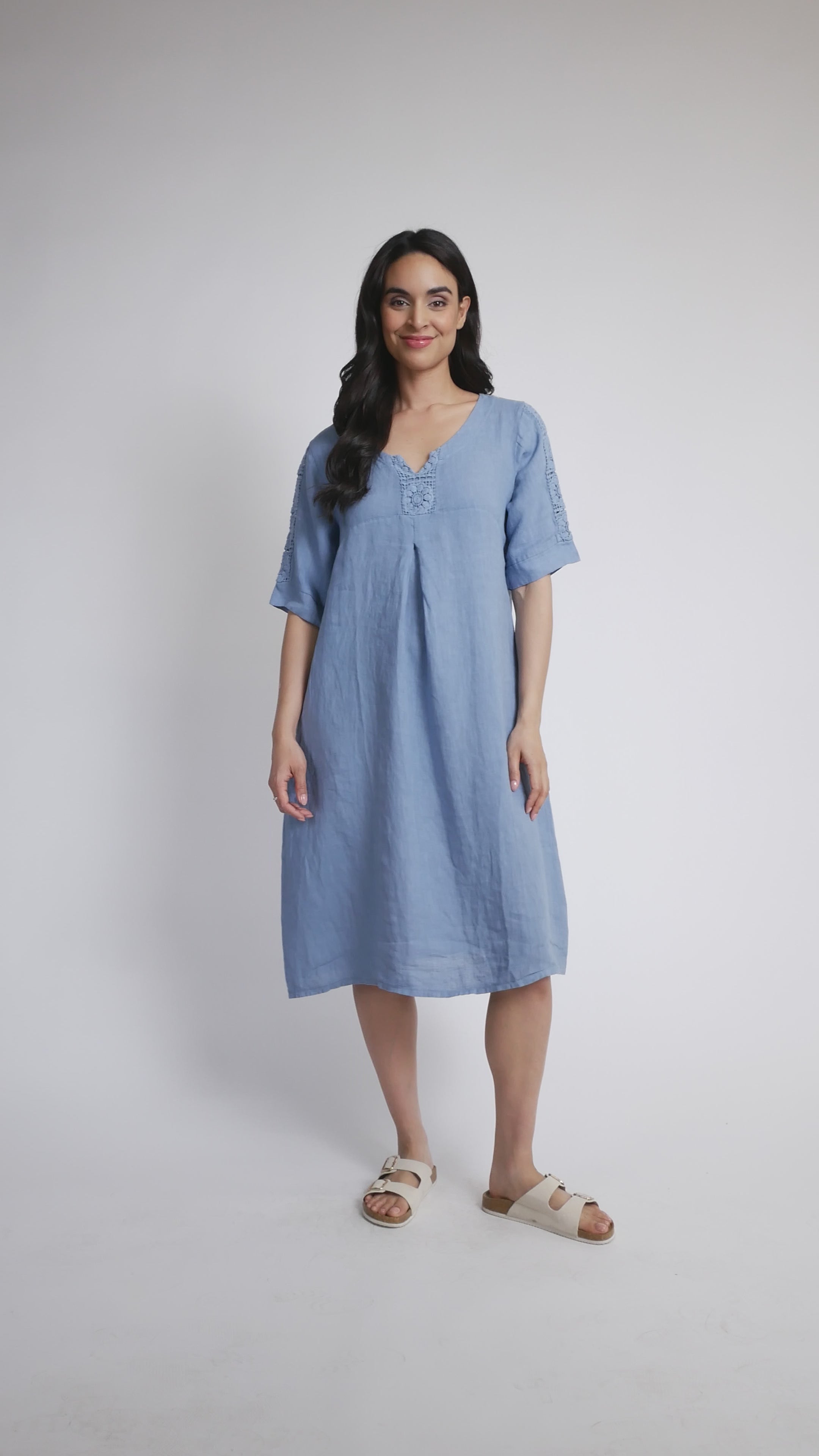 Effortlessly chic, this linen dress from Via Vitale brings Italian craftsmanship to your everyday wardrobe. Delicate crochet detailing adorns the V-neckline and elbow sleeves, adding a touch of charm that feels both timeless and modern. Crafted from breathable linen, it's the perfect piece for warm days when you want to look polished without trying too hard. Made in Italy with attention to detail that shows.