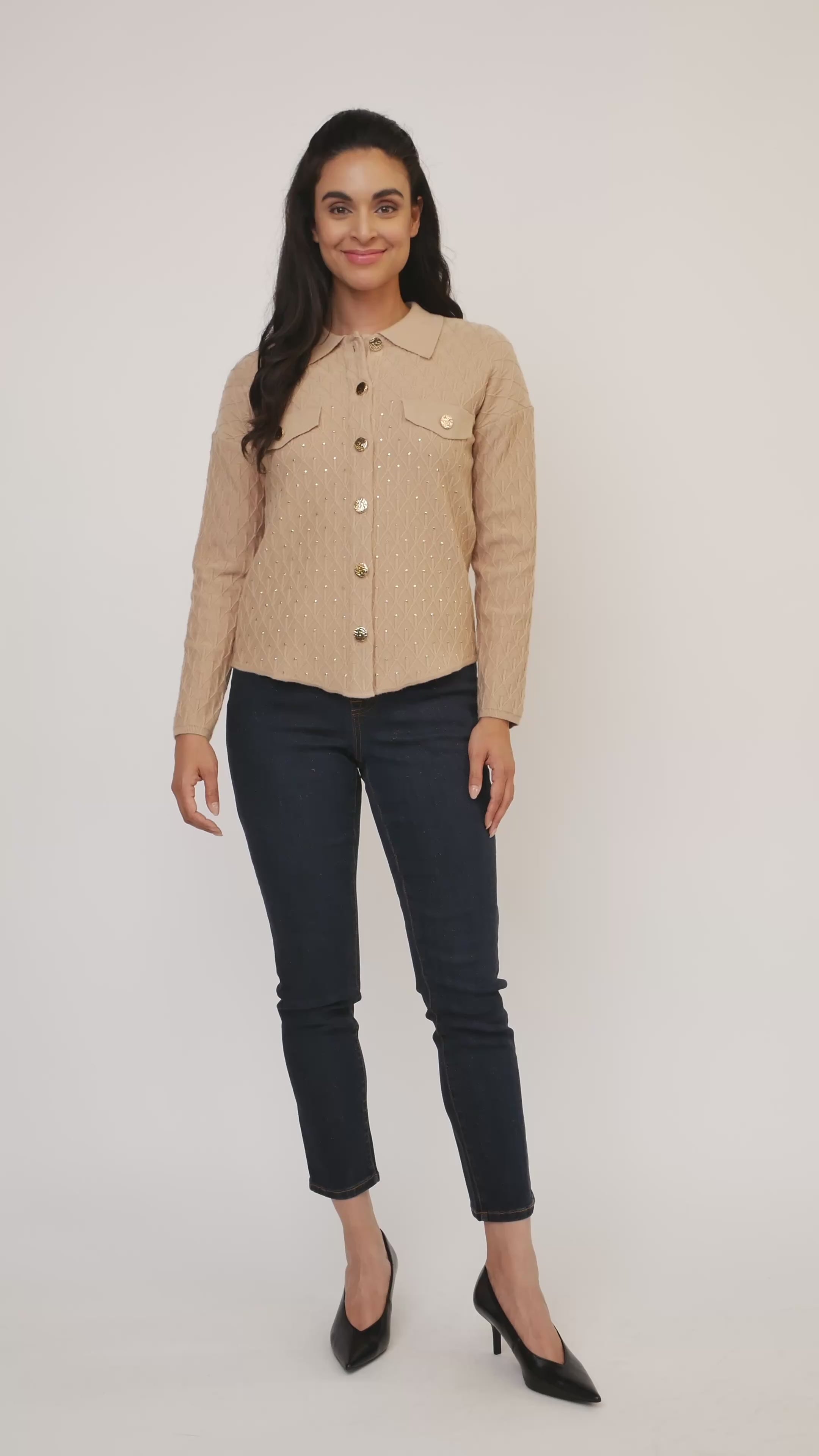This embossed shacket combines cozy knit fabric with stylish details like gold buttons and flap pockets with button accents. Featuring a classic shirt collar and a straight hemline, it’s perfect for layering with a fun twist.