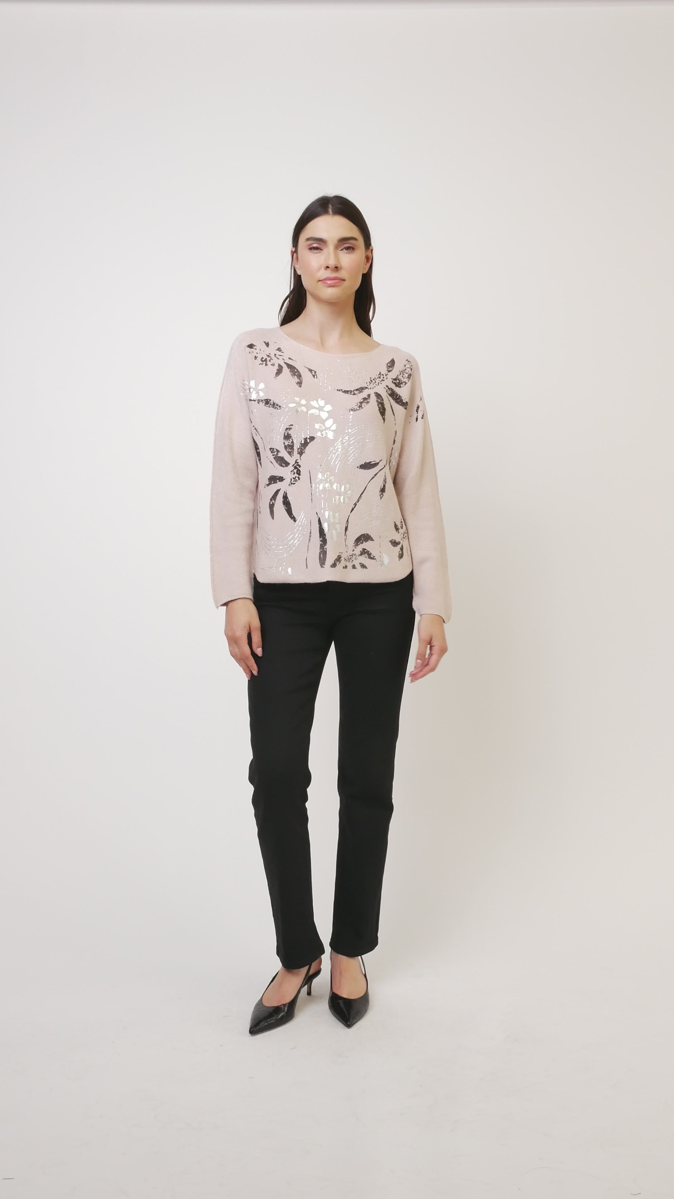 Elevate your cozy days with this foil leaves print sweater. Featuring long dolman sleeves and a flattering V-neckline, it’s crafted from soft Italian knit fabric topped with shimmering foil details that catch every eye. Perfect for adding a little sparkle to your casual look!