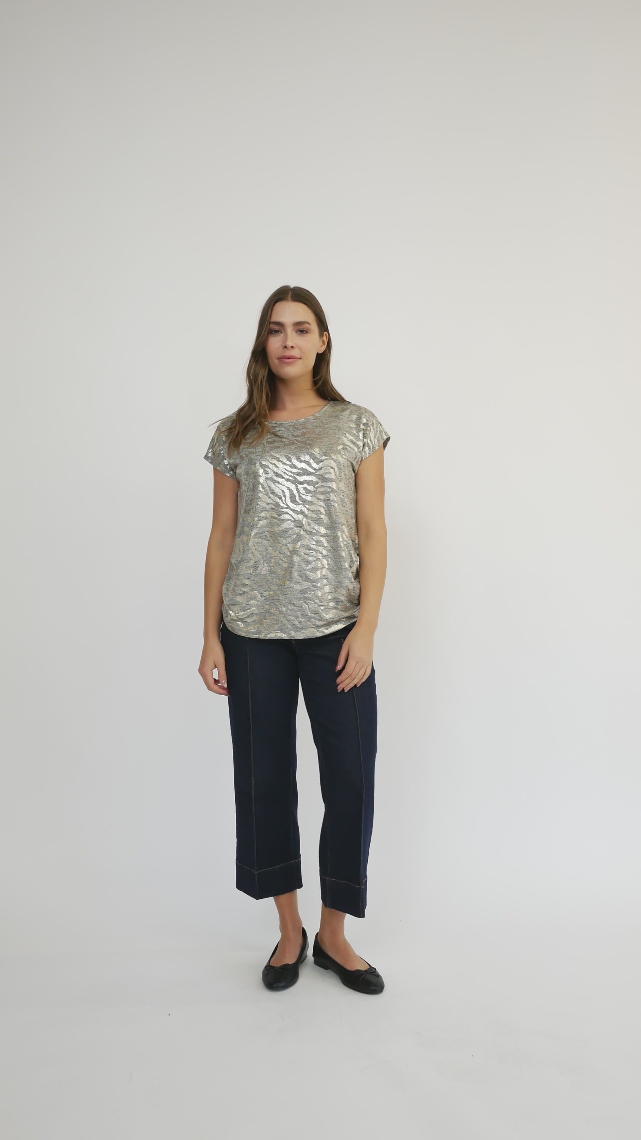 Add a touch of sparkle to your wardrobe with this gold foil knit top, crafted exclusively in Canada for Cazza Petite and Zacks. Featuring a cozy T-sleeve and classic crew neckline, its side ruching adds a flattering twist. Perfect for those who love a little shine and effortless style.