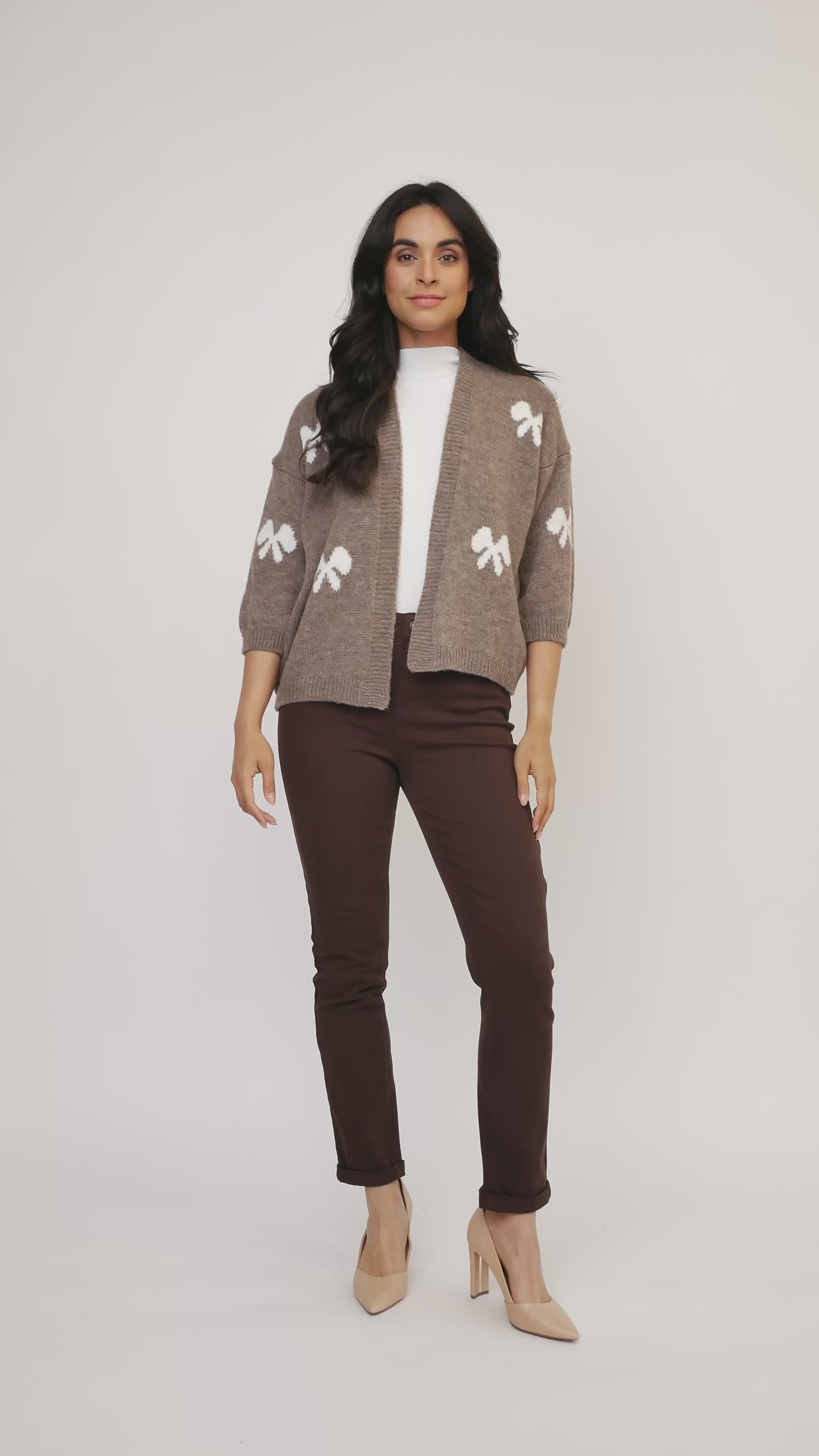 This cardigan features charming 3/4 sleeves and an open front with a delightful bow design, crafted from soft knit fabric. Made in Italy by Via Vitale, it brings a touch of European flair to your wardrobe while keeping you cozy and stylish. Perfect for layering with a fun twist!